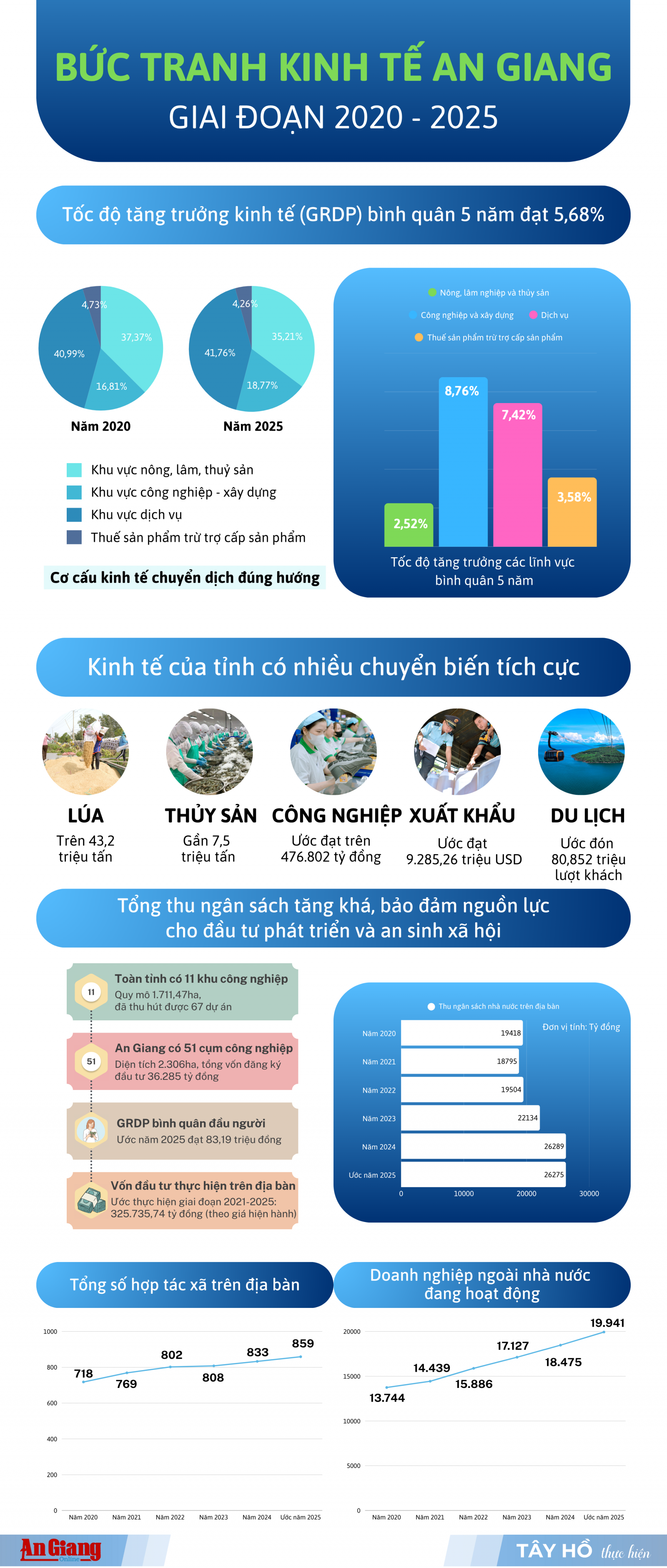 - Giai đoạn 2020 - 2025, kinh tế An Giang đạt nhiều kết quả nổi bật. Tốc độ tăng trưởng GRDP bình quân cả giai đoạn đạt 5,68%/năm. Những con số này khẳng định nỗ lực vượt khó, thích ứng linh hoạt của tỉnh trong bối cảnh kinh tế - xã hội có nhiều biến động.