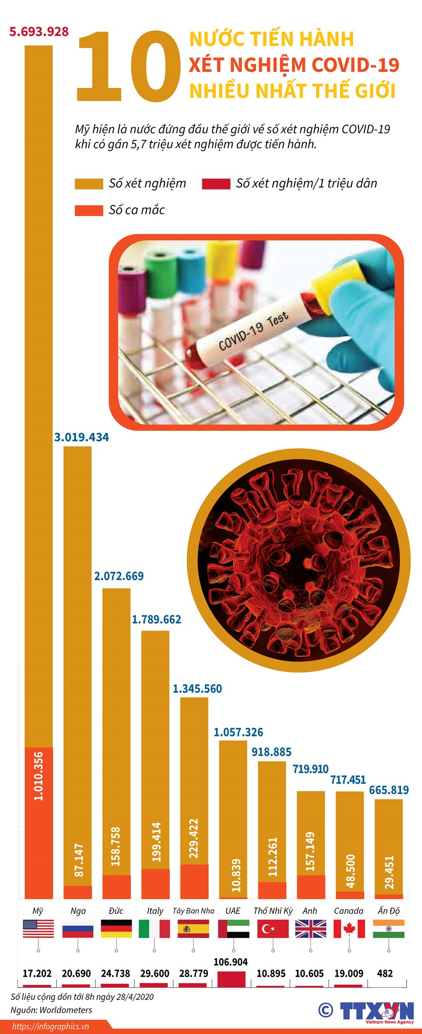 Mỹ hiện là nước đứng đầu thế giới về số xét nghiệm COVID-19 khi có gần 5,7 triệu xét nghiệm được tiến hành.