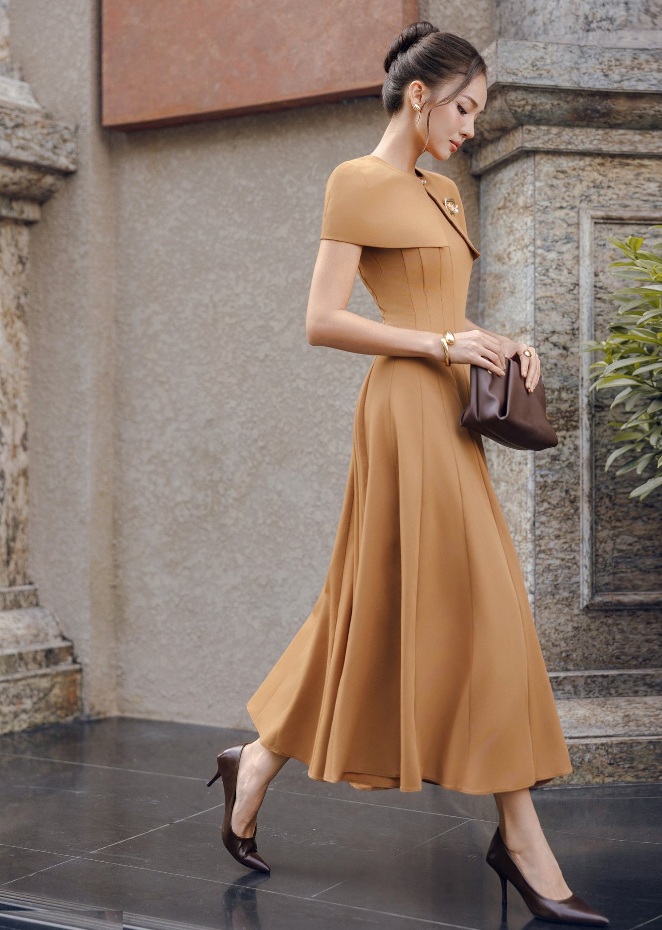 Gam màu nâu cam hiện đại, sang trọng được gợi ý phối cùng sắc nâu đất của giày cao gót và túi nhỏ cầm tay. Trang sức và phụ kiện cài áo mang sắc vàng gold làm nổi bật phong thái sang chảnh, kiêu kỳ của người mặc. ẢNH: PANTIO