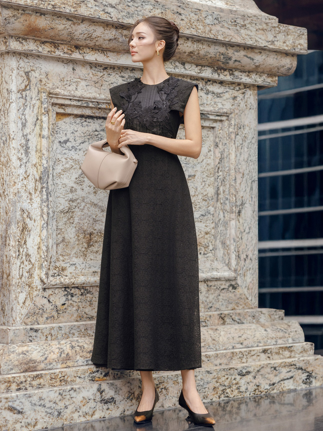 Trên sắc đen quen thuộc là vẻ sắc nét tinh tế của chất vải họa tiết phối hai lớp, phần hoa ren đắp trên thân trước và cách phối đồ thông minh khi kết hợp đen, be và một chút điểm nhấn mang sắc vàng gold trên mũi giày cao gót. ẢNH: PANTIO