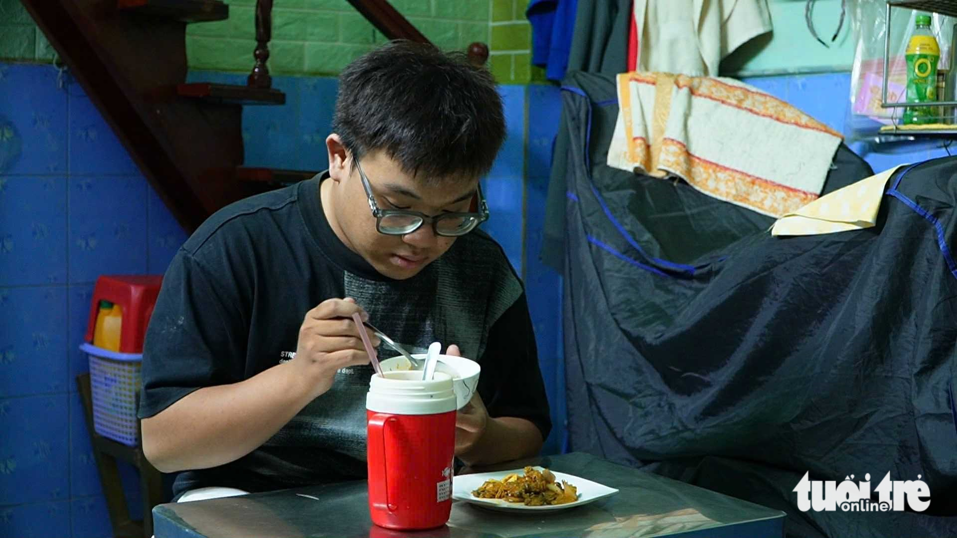Tan học, Phúc chỉ kịp ghé bếp nhà dì lùa vội bát cơm rồi lại đi làm thêm ca chiều ở quán cà phê - Ảnh: NGỌC SANG