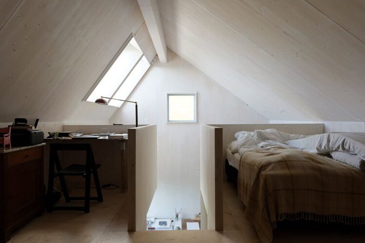 Phòng ngủ ở tầng gác mái, bên cạnh không gian làm việc nhỏ gọn - Ảnh: Marino Thorlacius/Dezeen