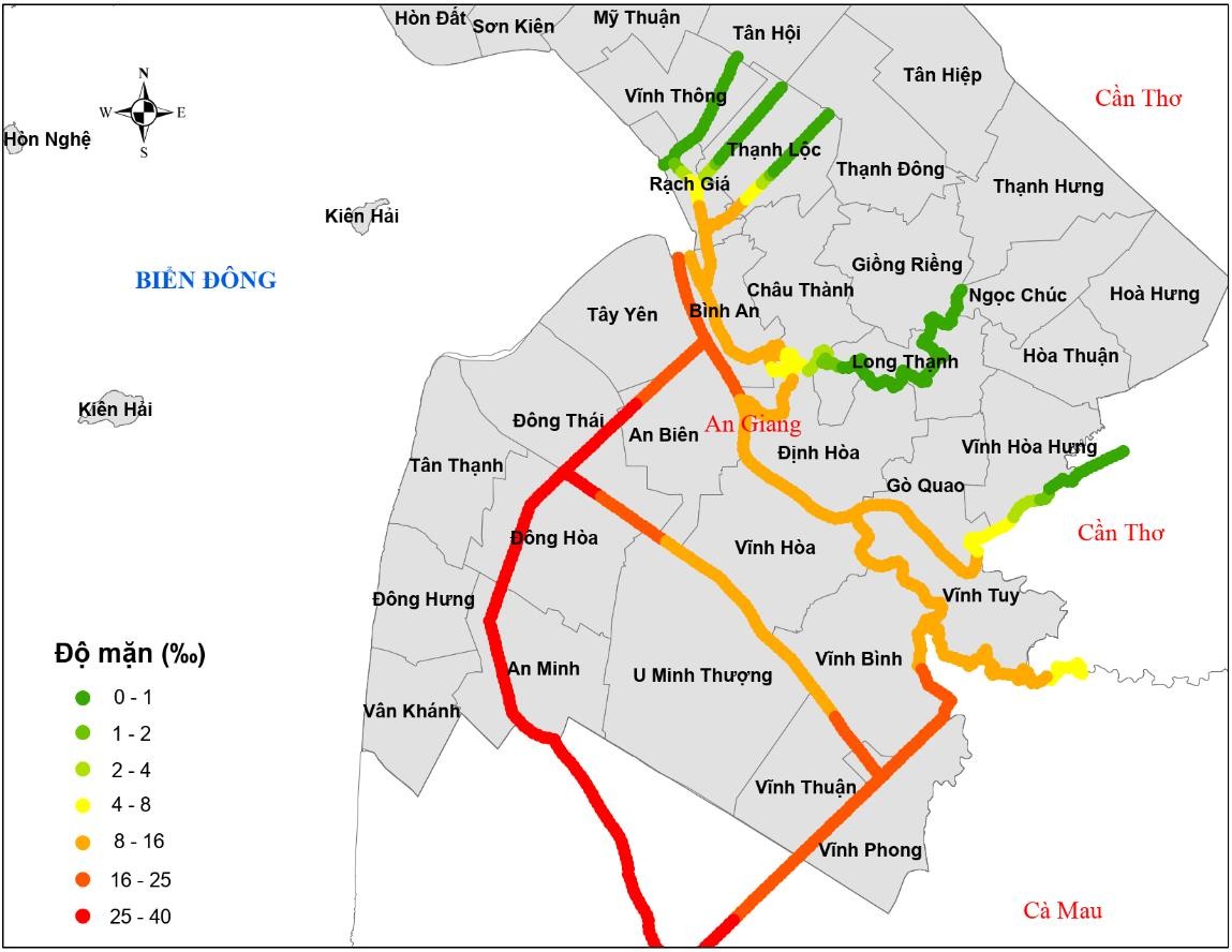 Độ mặn 4 phần ngàn xâm nhập sâu vào nội đồng các sông Cái Lớn, Cái Bé, kênh Cái Sắn vào buổi tối các ngày 3 đến 5/5, có khả năng ảnh hưởng đến cây trồng.