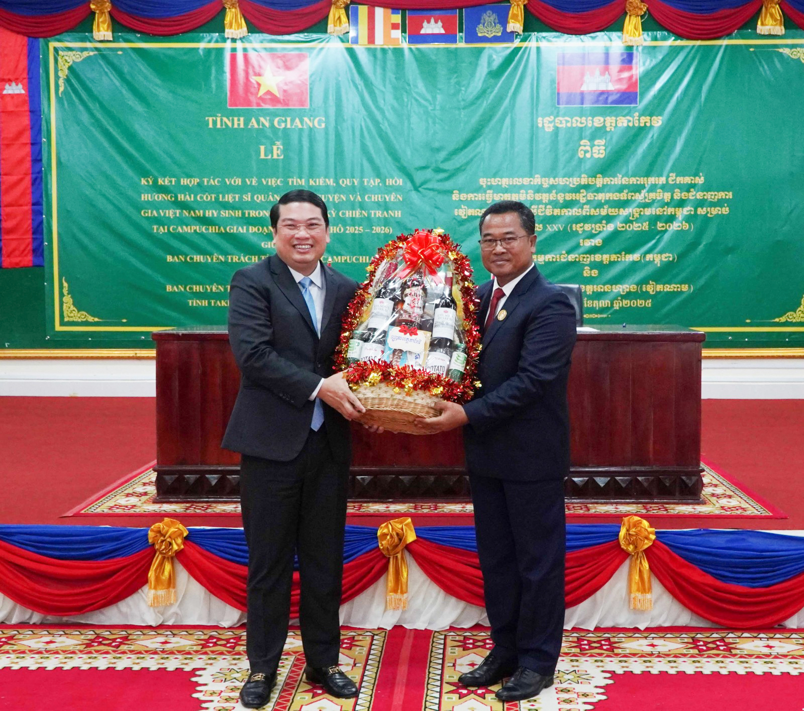 Phát biểu tại buổi lễ, ngài Sut Khon - Phó Tỉnh trưởng, Trưởng Ban Chuyên trách tỉnh Takeo vui mừng chào đón đoàn đại biểu tỉnh An Giang đến tổ chức lễ ký kết. Đồng thời đánh giá cao thời gian qua hai tỉnh Takeo - An Giang đã hợp tác tìm kiếm, quy tập, hồi hương hài cốt liệt sĩ quân tình nguyện và chuyên gia Việt Nam hy sinh trong các thời kỳ chiến tranh tại Campuchia trên địa bàn tỉnh Takeo đạt nhiều kết quả.