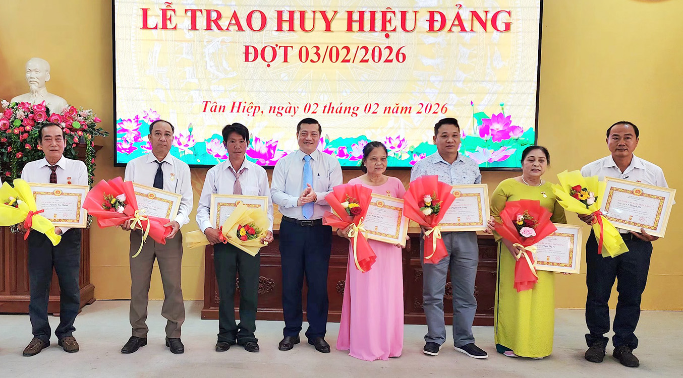 Tại buổi lễ, Ban Thường vụ Đảng ủy xã Tân Hiệp trao tặng Huy hiệu Đảng từ 30 năm đến 50 năm tuổi Đảng cho 25 đảng viên.