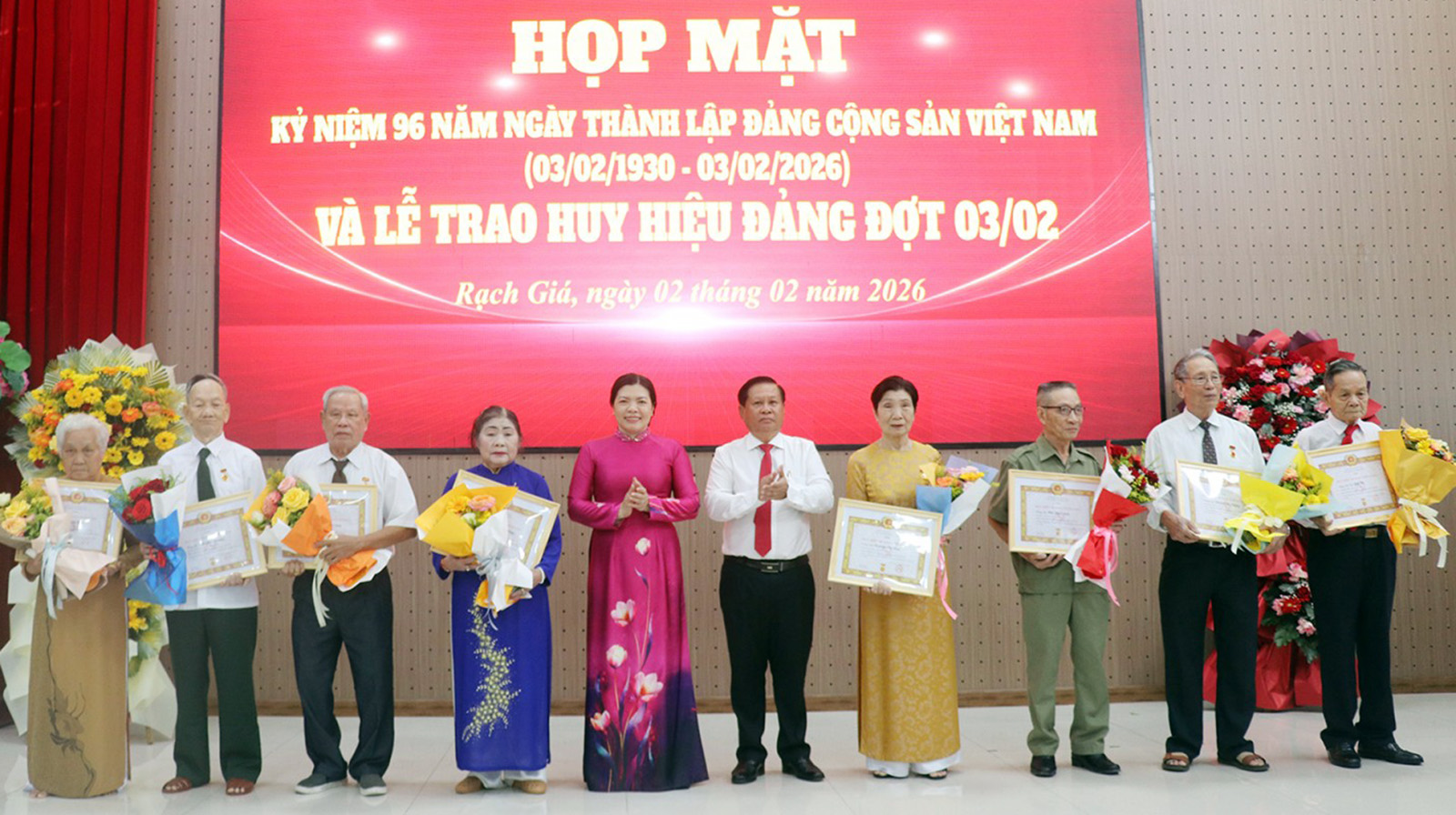 Ủy viên Ban Thường vụ Tỉnh ủy, Bí thư Đảng ủy phường Rạch Giá Mai Hoàng Khởi (thứ năm, từ phải qua) và Phó Bí thư Thường trực Đảng ủy, Chủ tịch HĐND phường Rạch Giá Nguyễn Thị Hoàn Xuân trao Huy hiệu 60 năm tuổi Đảng cho đảng viên.
