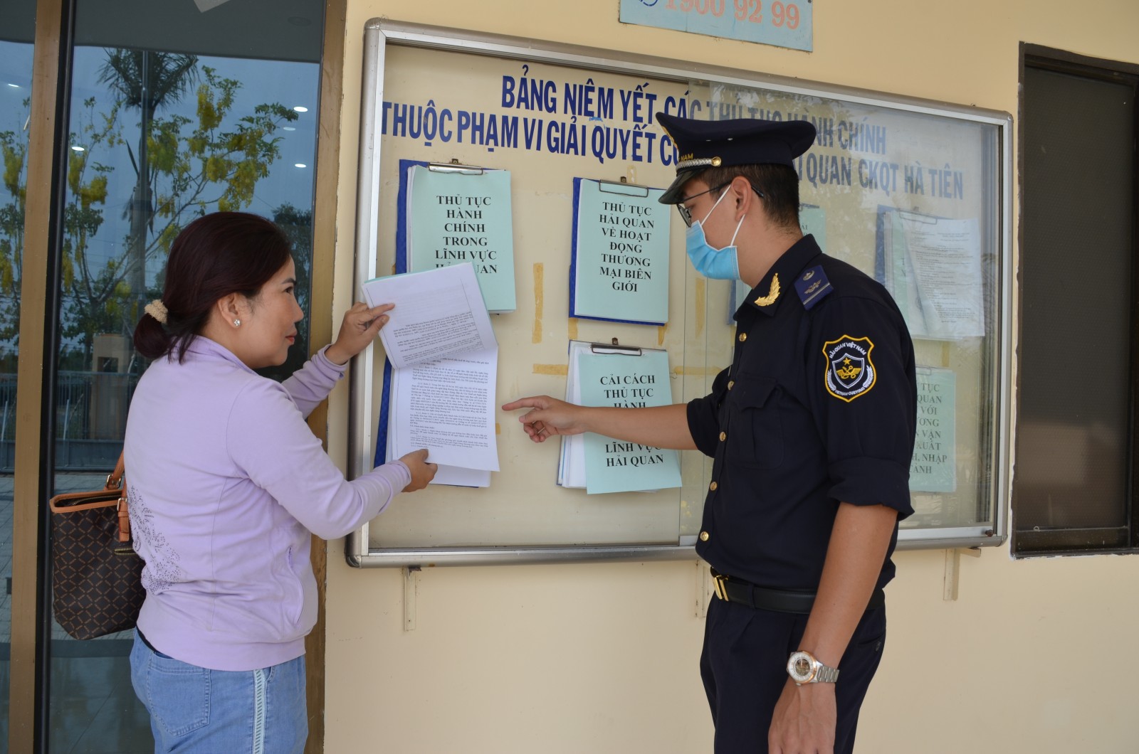Doanh nghiệp tra cứu thủ tục hành chính hải quan được niêm yết công khai tại Cửa khẩu quốc tế Hà Tiên.