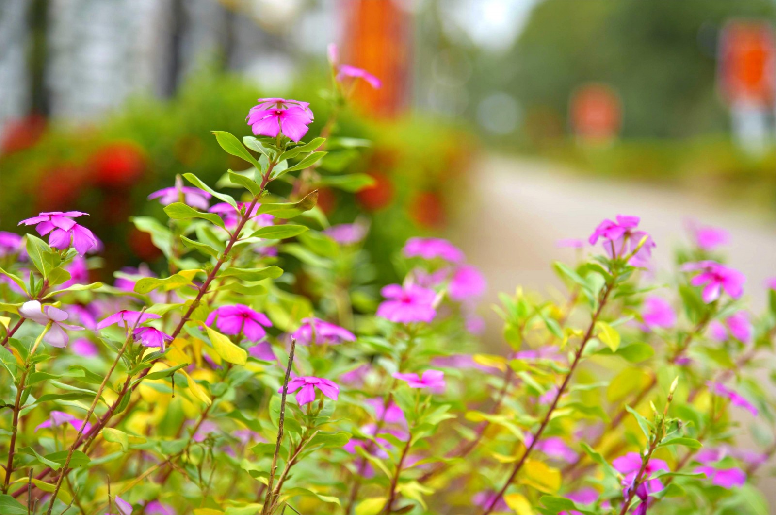Bông dừa cạn được trồng xen dưới hàng rào, điểm tô thêm sắc hồng cho đường quê thêm rực rỡ.