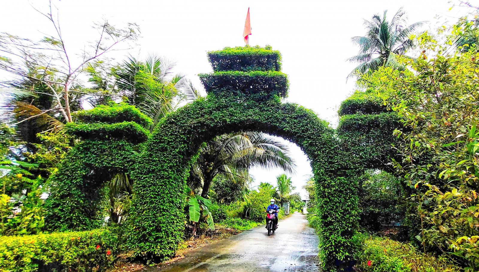 Cổng tam quan bằng cây xanh do ông Nguyễn Văn Hoàng, ngụ ấp 11A, tự tay trồng cách nay 10 năm, điểm nhấn đầu tiên của tuyến đường nông thôn mới.