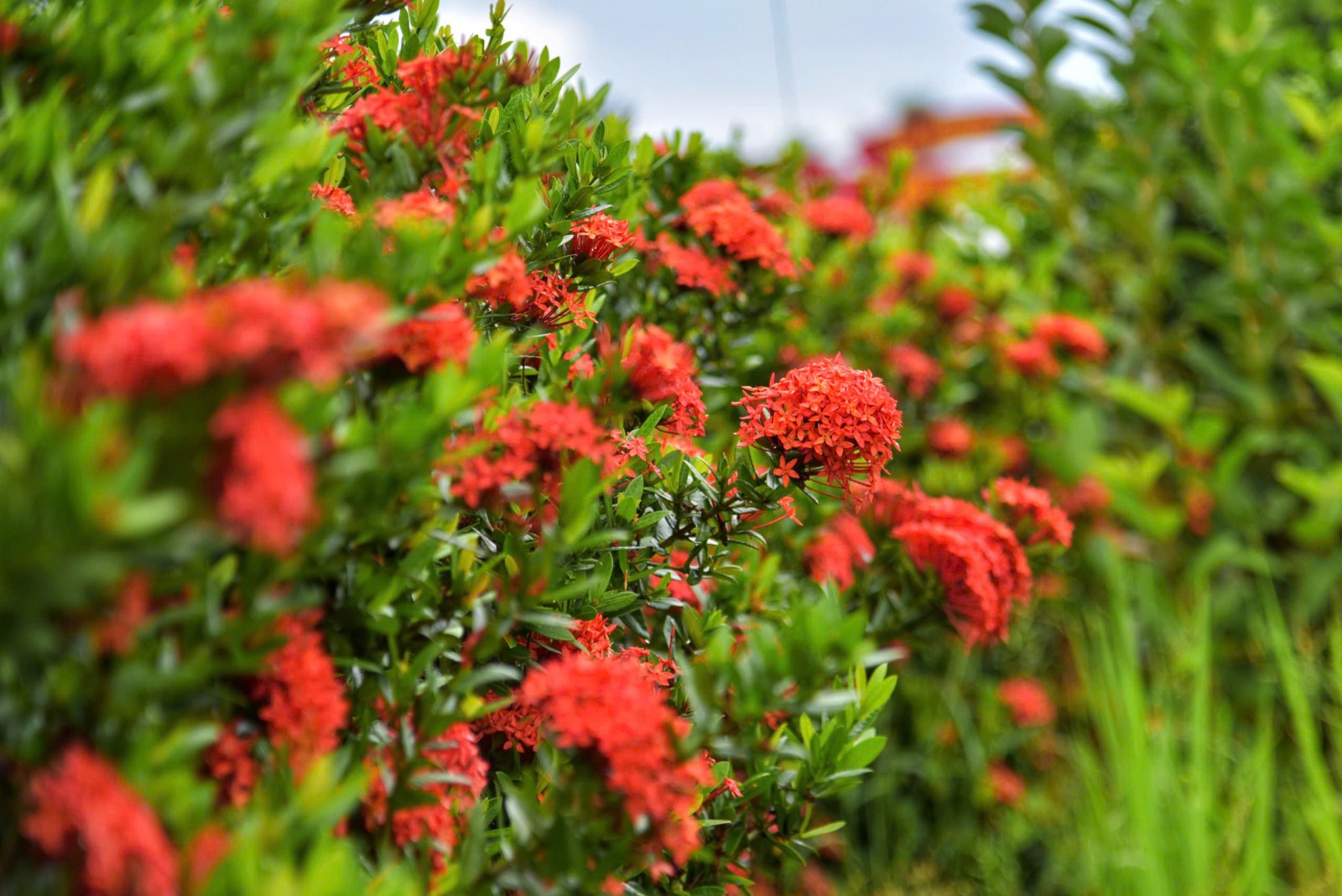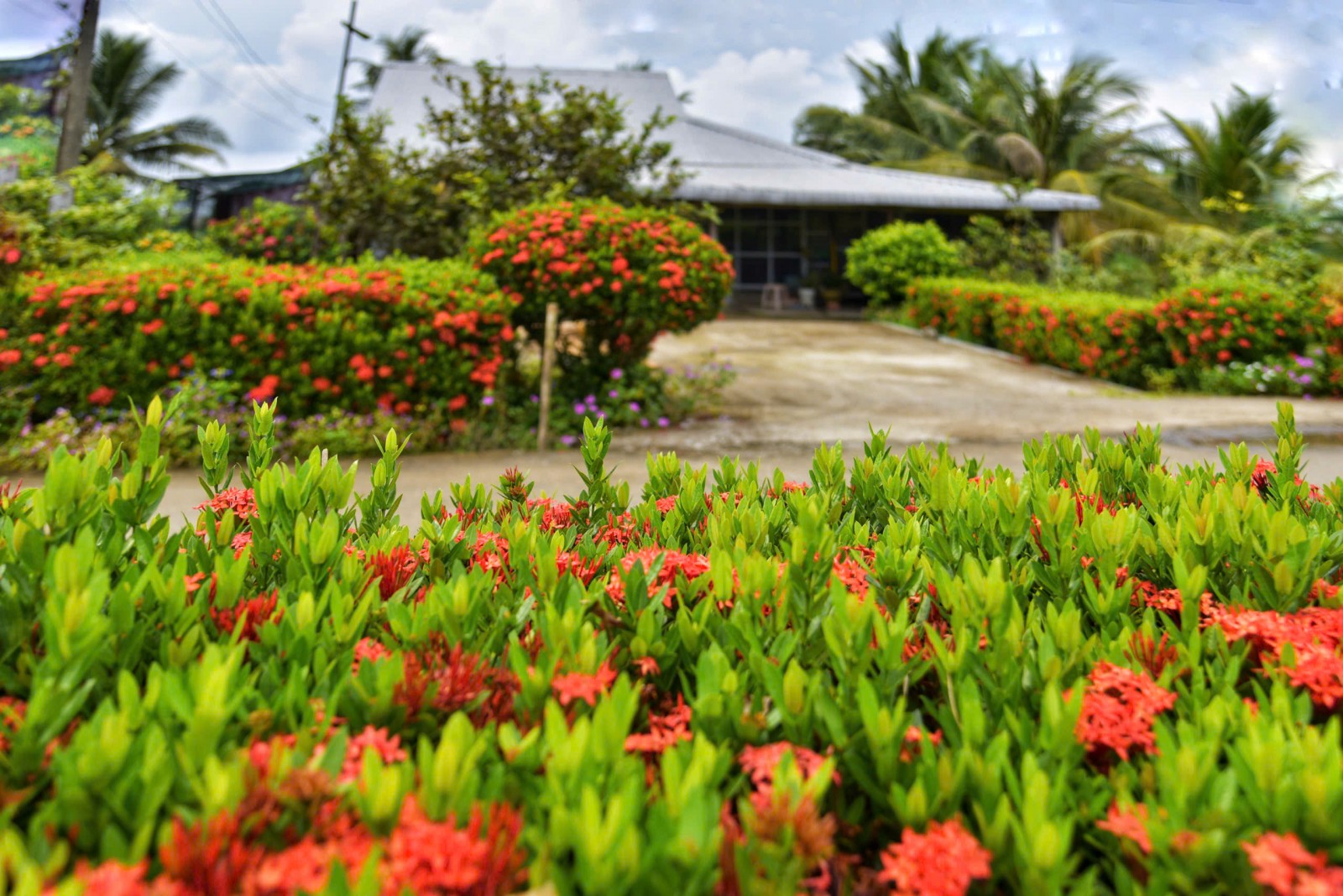 Hàng rào bông trang ấp Ngã Bát được ông Trần Văn Hà cắt tỉa đều đặn mỗi tuần, hoa nở quanh năm.