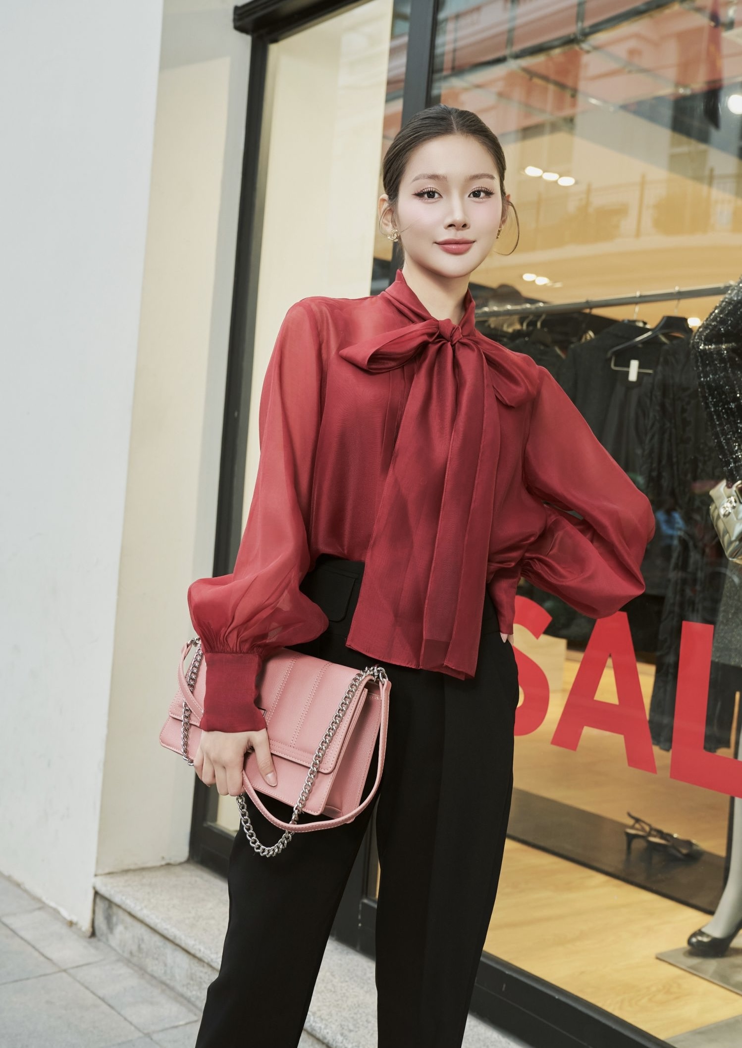 Áo blouse màu đỏ tía rực rỡ, được may bằng chất liệu chiffon mỏng, nổi bật với thiết kế cổ nơ to bản và tay áo dài bồng bềnh, tạo vẻ ngoài sang trọng và quyền lực. Sơ vin gọn gàng với quần tây cạp cao ống đứng màu đen, tạo sự tương phản mạnh mẽ.