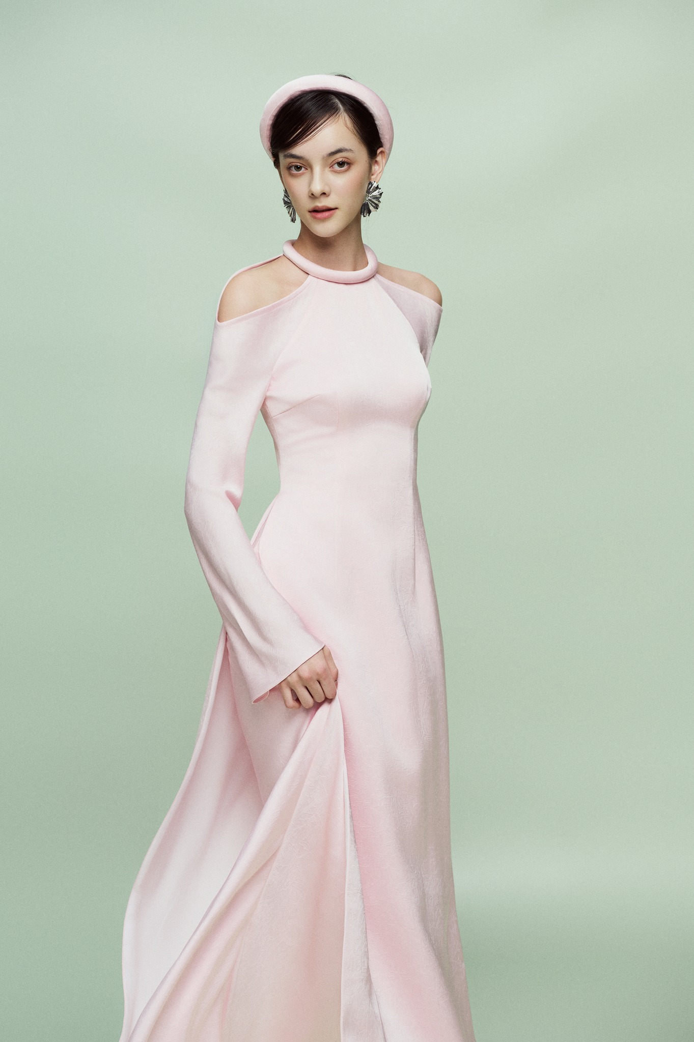 Áo dài màu hồng phấn gợi nhắc nét quyến rũ tinh khôi của phái nữ. Thiết kế khéo léo khoe bờ vai thanh mảnh qua đường cut out táo bạo; chi tiết cổ tròn tone sur tone với mấn đội đầu gợi nhắc hình ảnh phụ nữ Việt thời xưa nhưng dưới góc nhìn hiện đại và tươi mới hơn. ẢNH: ESTHER STUDIOS