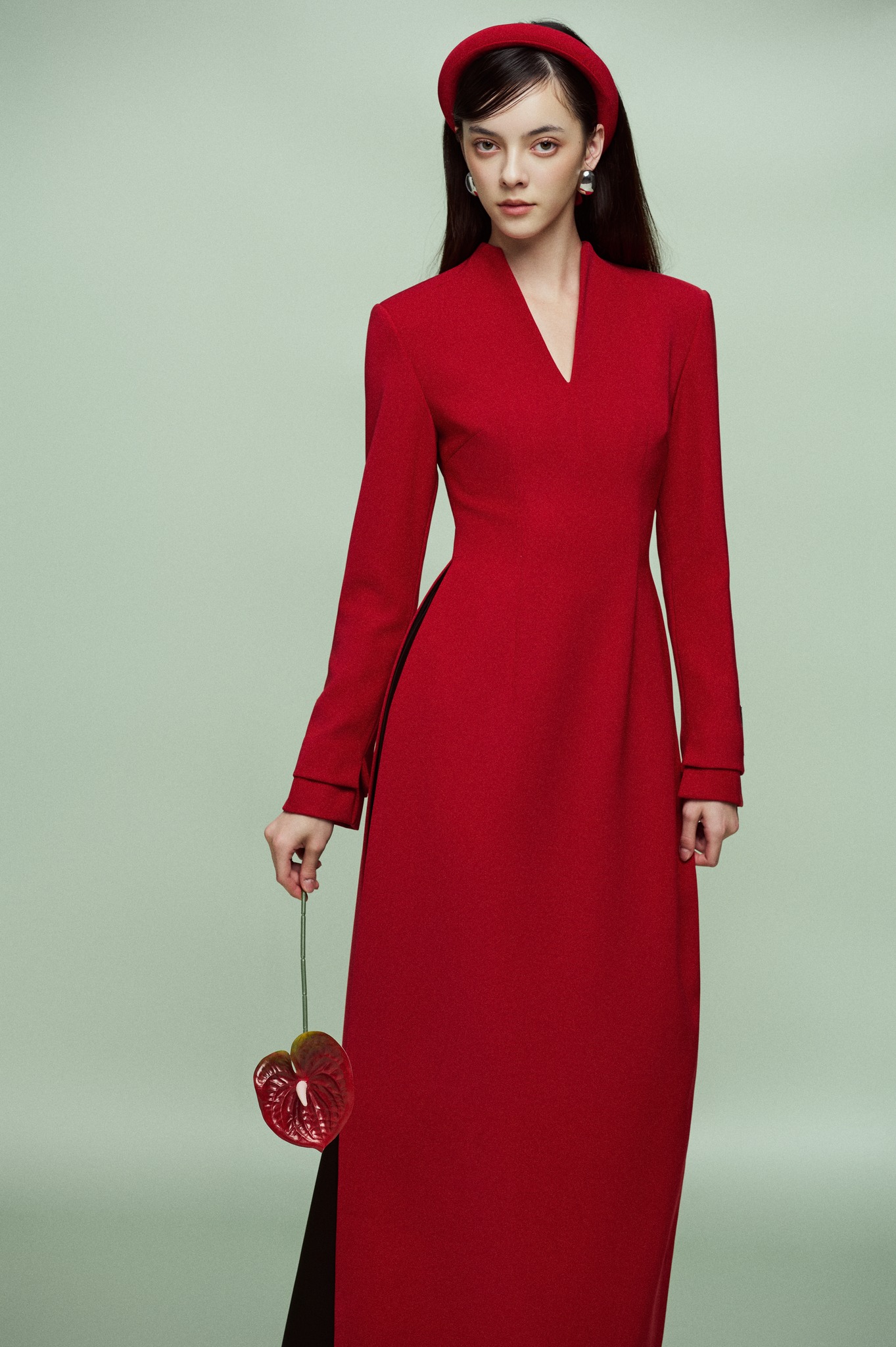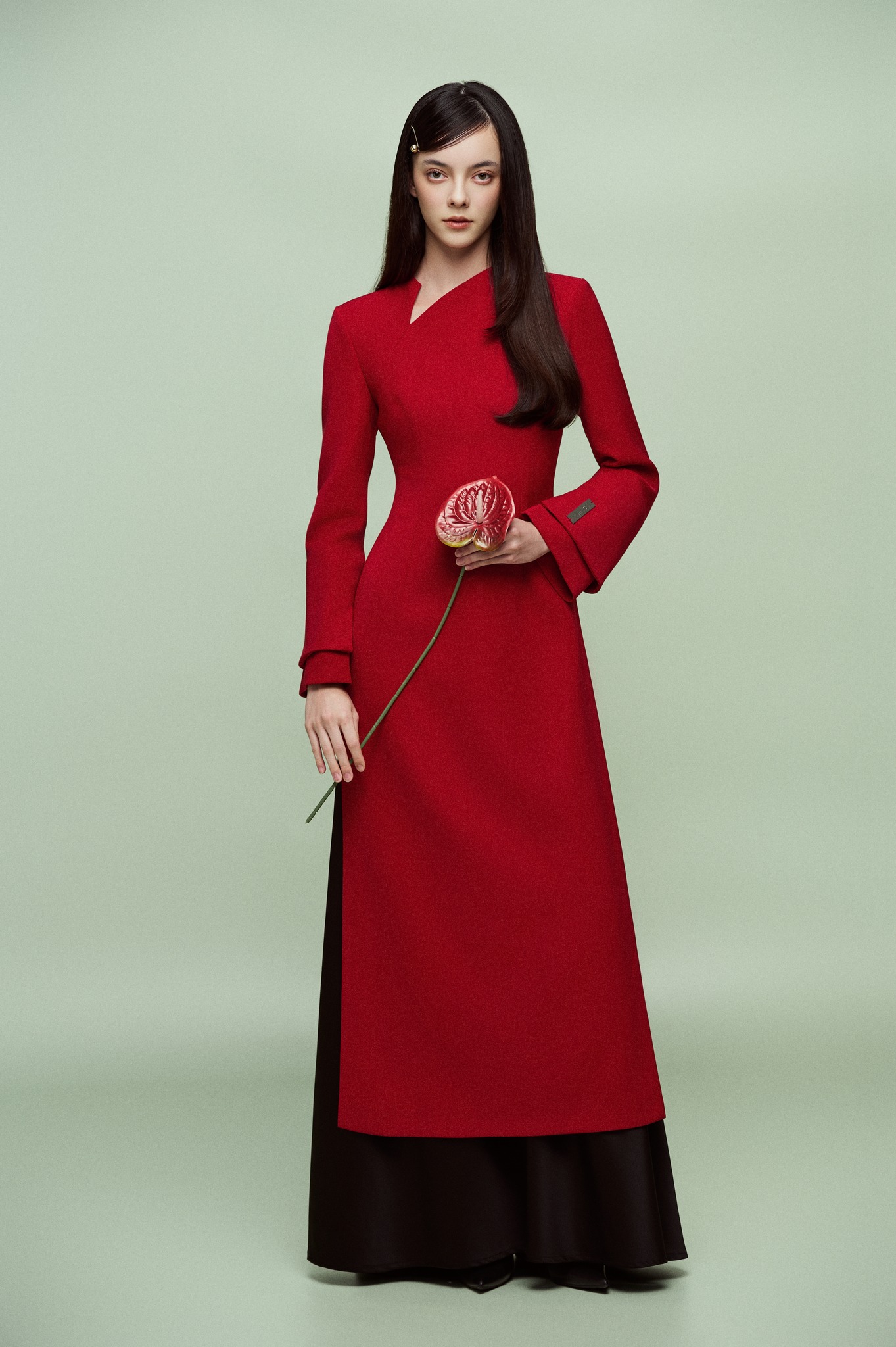 Áo dài cổ chữ V gây ấn tượng thị giác mạnh mẽ. Sắc đỏ - đen kết hợp hài hòa tạo nên hình ảnh vừa sắc sảo, quyền lực vừa mềm mại và giàu nữ tính. ẢNH: ESTHER STUDIOS