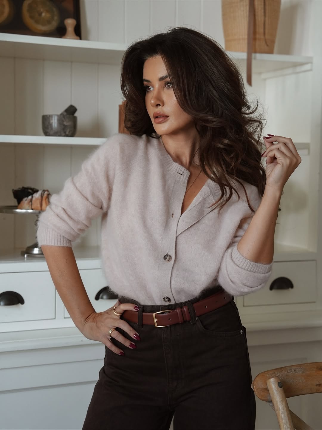 Cặp đôi hoàn hảo mùa lạnh gọi tên len sợi và denim trong hình dáng điển hình của cardigan và quần jeans cạp cao tôn dáng. ẢNH: FUSUN LINDNER
