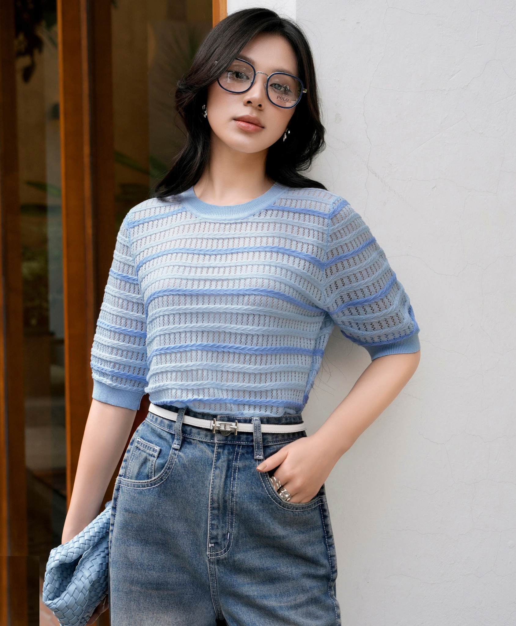 Vẻ cuốn hút từ các thiết kế áo dệt kim nằm ở phần họa tiết nổi trên bề mặt trang phục, chúng được tạo ra từ việc áp dụng các kỹ thuật dệt khác nhau. Áo cổ tròn họa tiết sọc ngang phối quần denim và dây lưng da bản nhỏ là bản phối phù hợp mặc đi học, đi làm. ẢNH: PANTIO