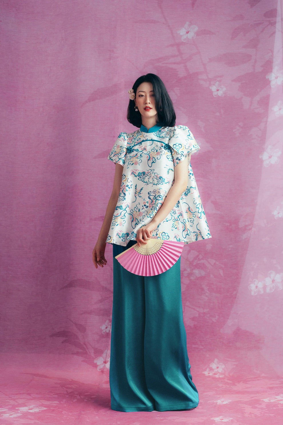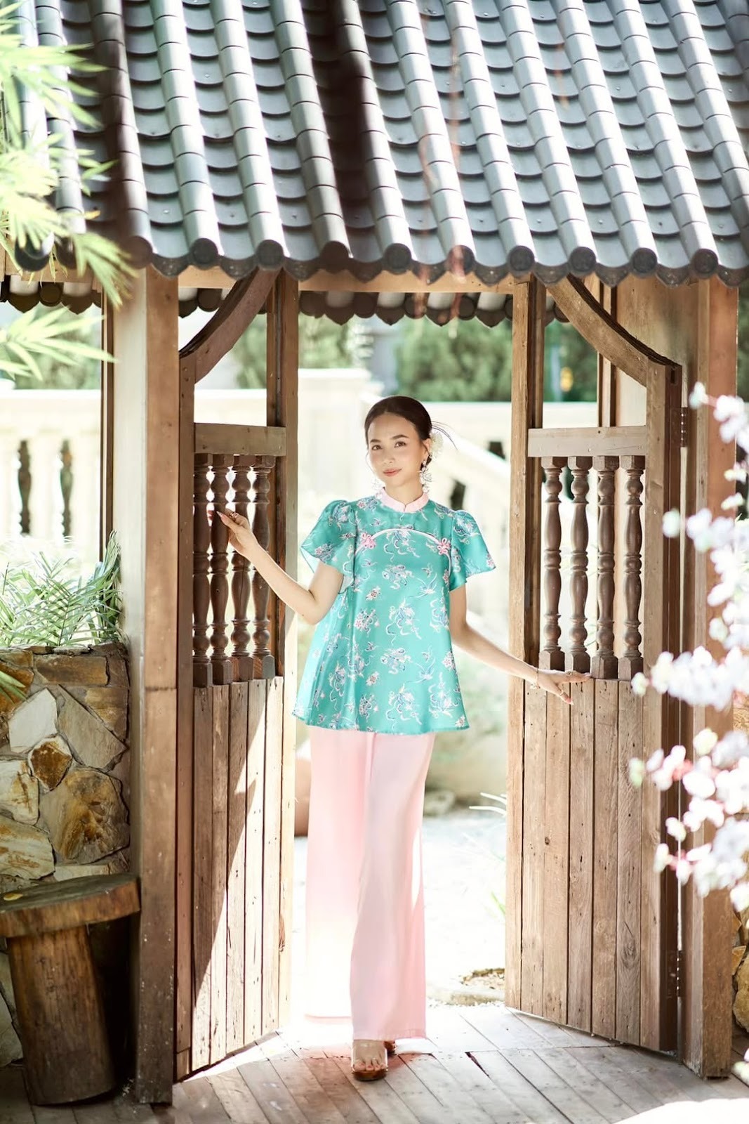 Sắc xanh ngọc và hồng phấn là sự kết hợp gợi nhớ đến những khu vườn xuân rực rỡ. Ngày đầu năm lựa chọn một thiết kế áo gấm tafta in hoa văn chìm sang trọng, dáng áo xòe nhẹ với cổ trụ viền hồng tinh tế giúp tôn lên nét ngọt ngào. ẢNH: @DINHNGOCDIEP