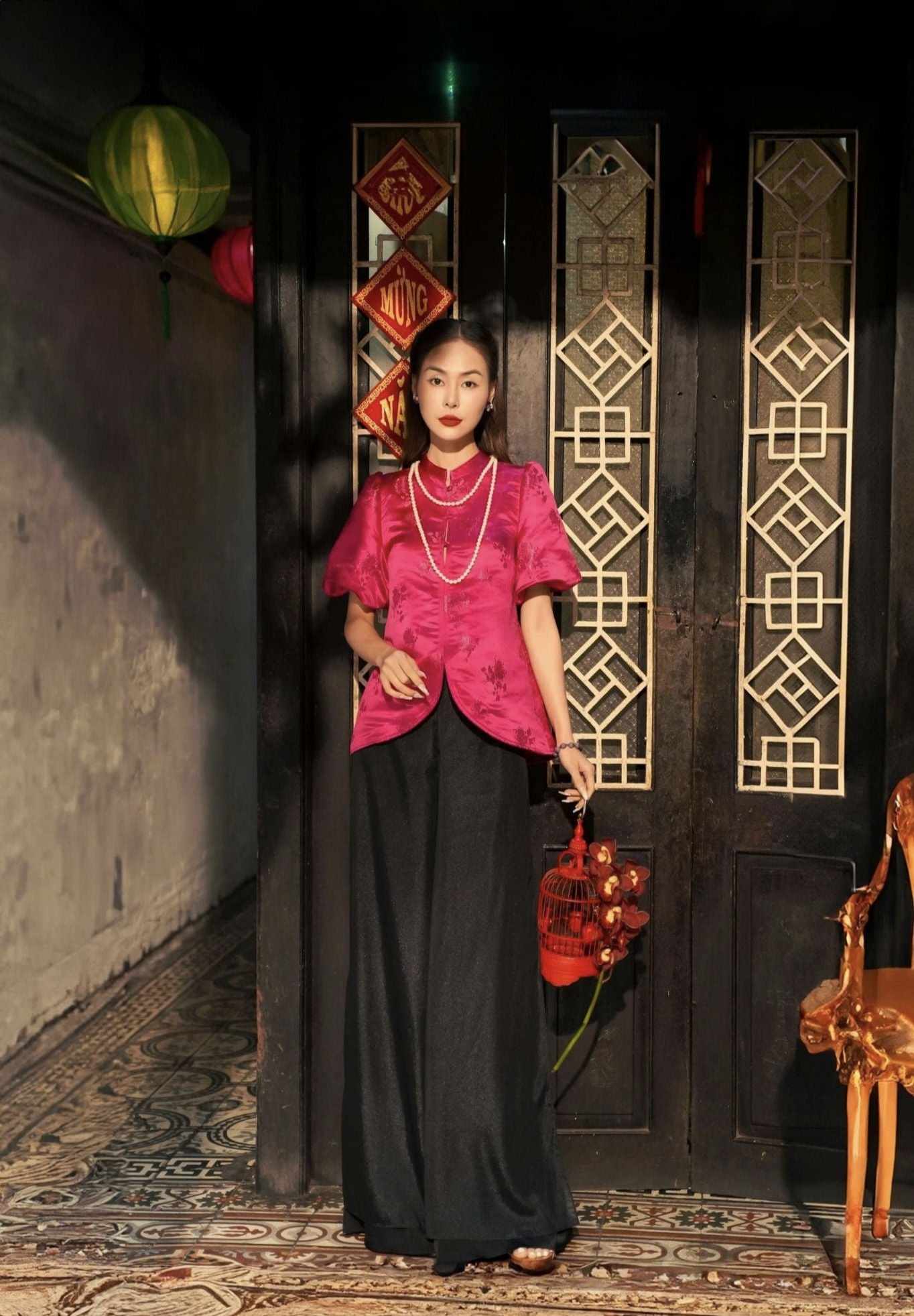 Khi kết hợp cùng quần lụa phù hợp mang đến nét hài hòa, phù hợp cho những buổi du xuân đầu năm. ẢNH: LALIN
