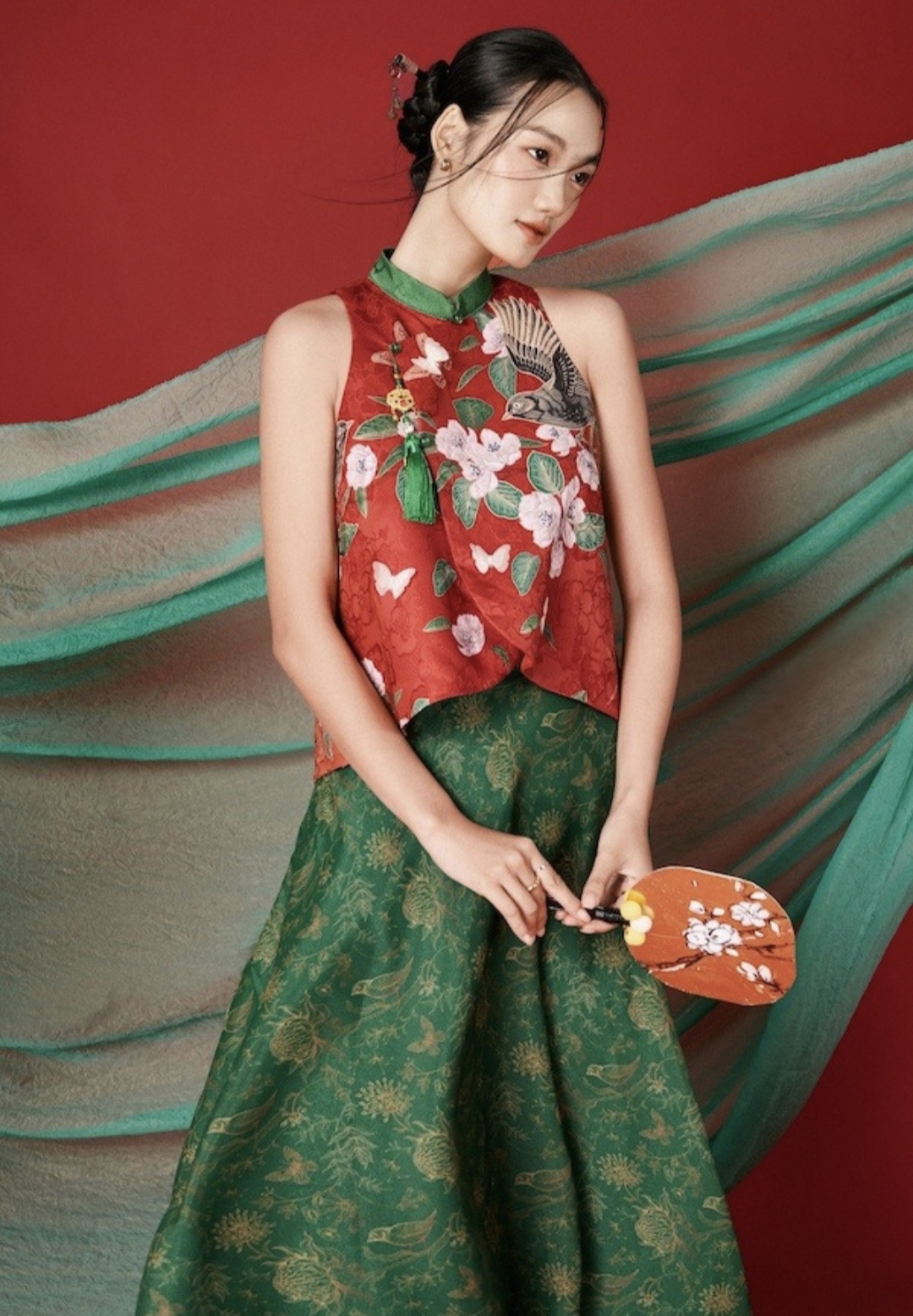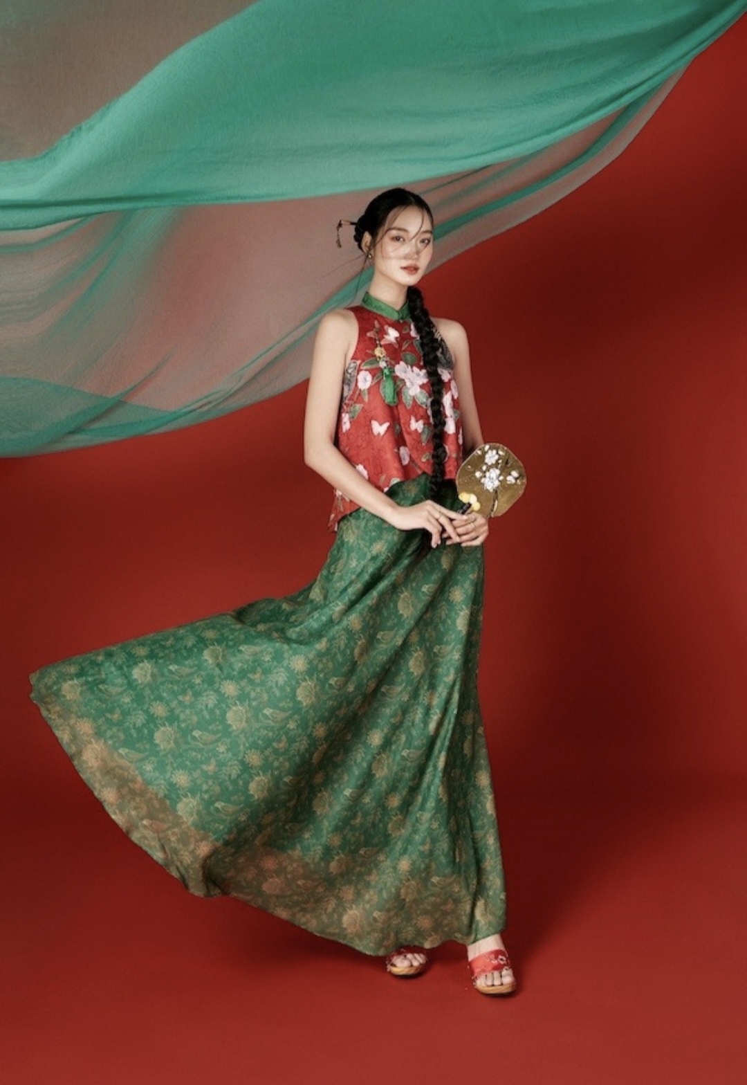 Lựa chọn kết hợp sắc đỏ và xanh lá mùa xuân là tượng trưng cho may mắn và sức sống. Thiết kế áo yếm cách điệu kết hợp chân váy gấm dài duyên dáng. Những họa tiết thêu nổi trên sắc xanh - trắng nổi bật trên nền vải gấm đỏ tôn lên tươi tắn, họa tiết hoa lá chìm trên chân váy xanh lá cũng dễ dàng thu hút mọi ánh nhìn. ẢNH: OCEANA LONDON