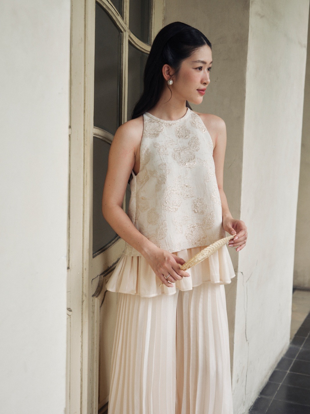 Mang sắc kem nhẹ nhàng, chiếc áo cổ yếm vải gấm với hoa văn dập nổi tạo cảm giác sang trọng mà không phô trương, kết hợp quần ống rộng cùng tông với thiết kế xếp ly tăng thêm nét nữ tính. Phom dáng tối giản giúp trang phục dễ dàng ứng dụng khi dạo phố ngày xuân, đồng thời vẫn giữ được nét trang trọng cần có của trang phục tết. ẢNH: LA BOUTIQUE