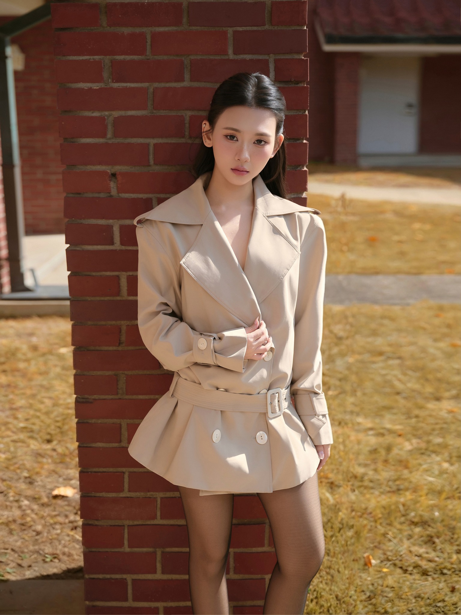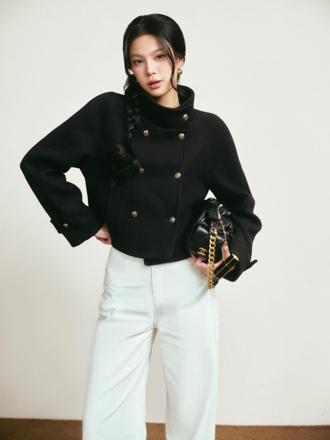 Áo trench coat dáng ngắn là sự kết hợp của cổ điển và hiện đại, cái nhìn vừa quen thuộc lại vừa lạ lẫm. Chi tiết ve cổ, hai hàng cúc cùng dáng vai vuông vức khéo tạo dấu ấn mạnh mẽ và cá tính nhưng phần thân áo được crop ngắn mang lại cảm giác phá cách tinh tế và trẻ trung. ẢNH: COLIN
