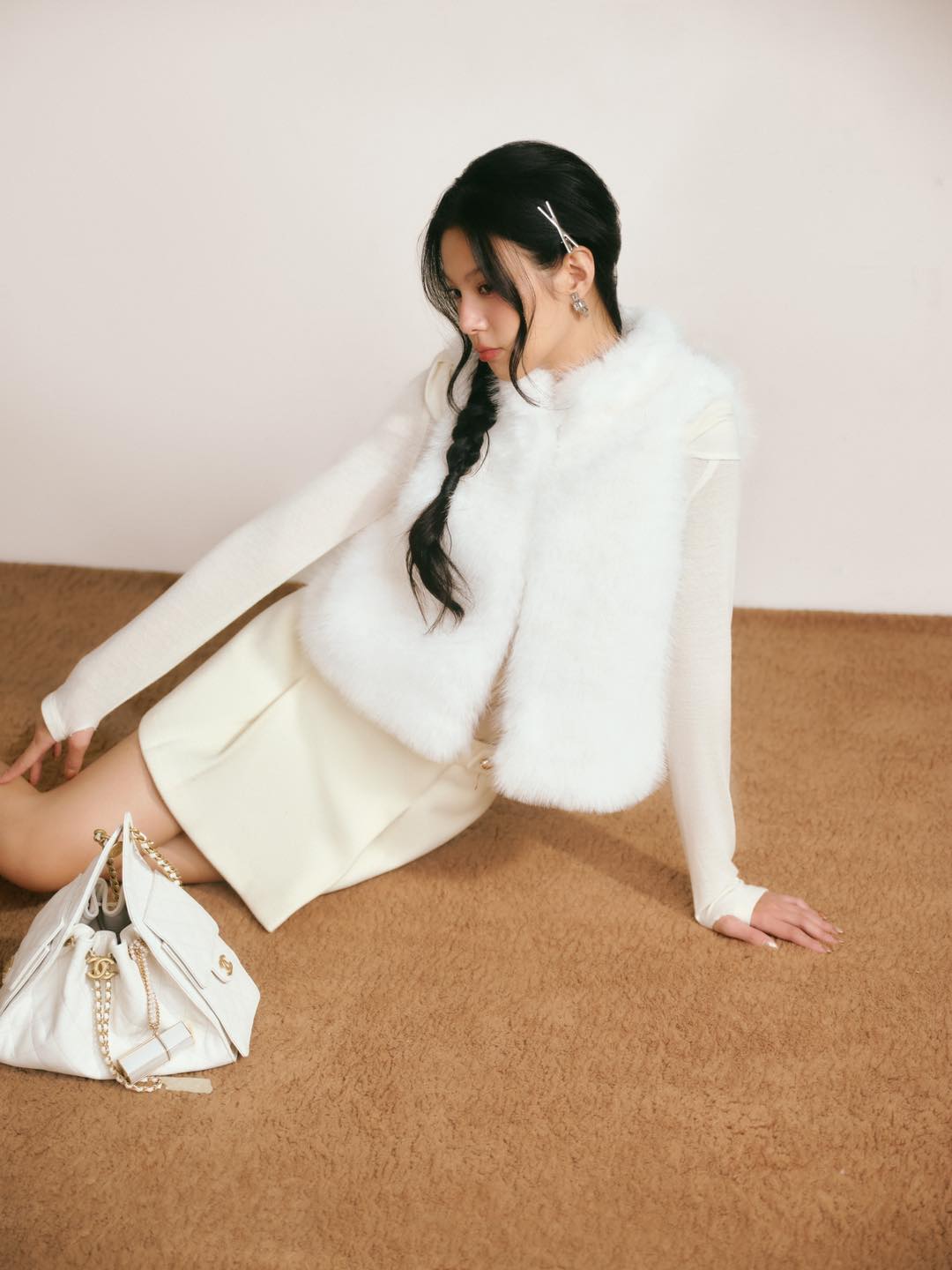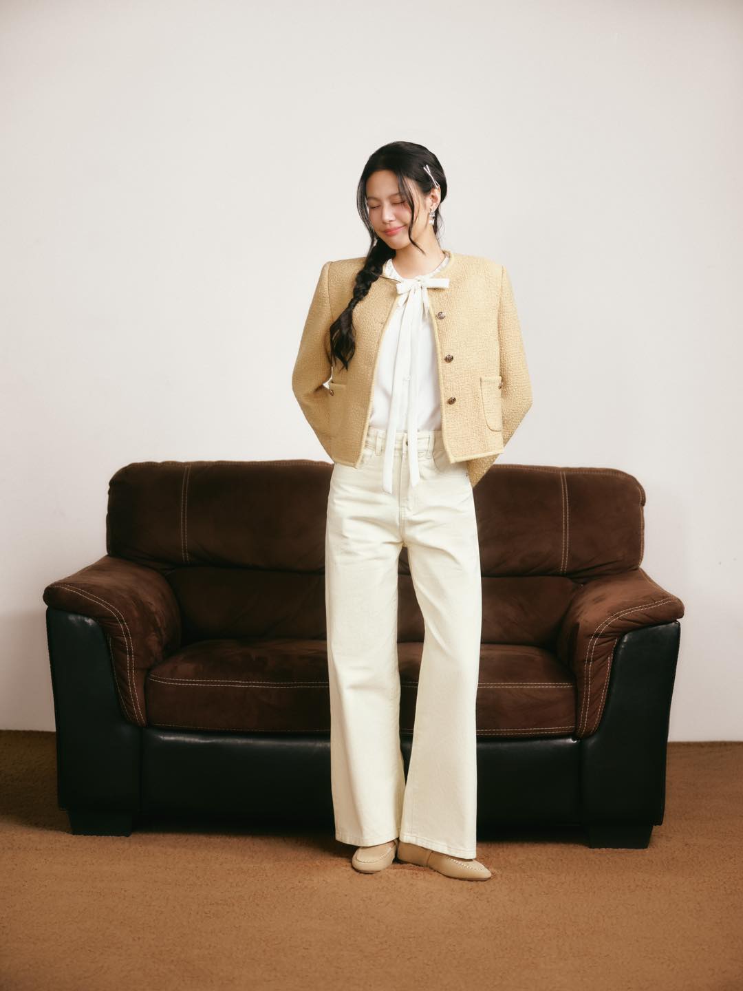 Sự giản đơn không cầu kỳ mà vẫn nổi bật và lộng lẫy nhờ sự kết hợp màu sắc đậm nhạt có chiều sâu. Áo sơ mi buộc nơ phối chân váy bút chì được tạo điểm nhấn bằng thiết kế áo dạ lông cừu khâu tay mang nét sang chảnh, quý phái. ẢNH: CHIC LAND
