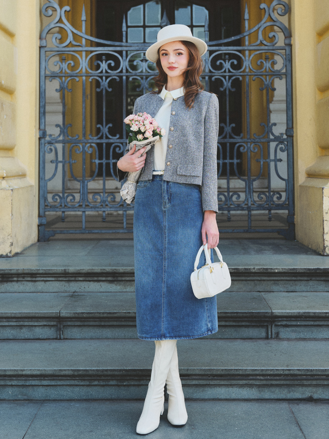 Chân váy dài từ vải denim phù hợp với áo khoác màu xám, các món đồ tông trắng sáng như áo cổ nơ, bốt, mũ và túi xách bổ sung cho bản phối giành trọn "điểm 10" hoàn hảo về phong cách mùa lạnh. ẢNH: OYSTER