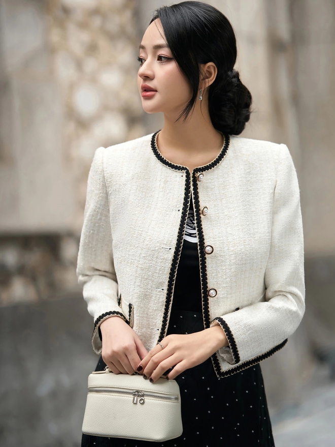 Khoác hờ chiếc áo tweed màu xanh bạc hà khi diện váy dài màu trắng kem ấm áp, mềm mại và tôn dáng, nàng trở thành phiên bản đẹp nhất của chính mình. ẢNH: IVY MODA