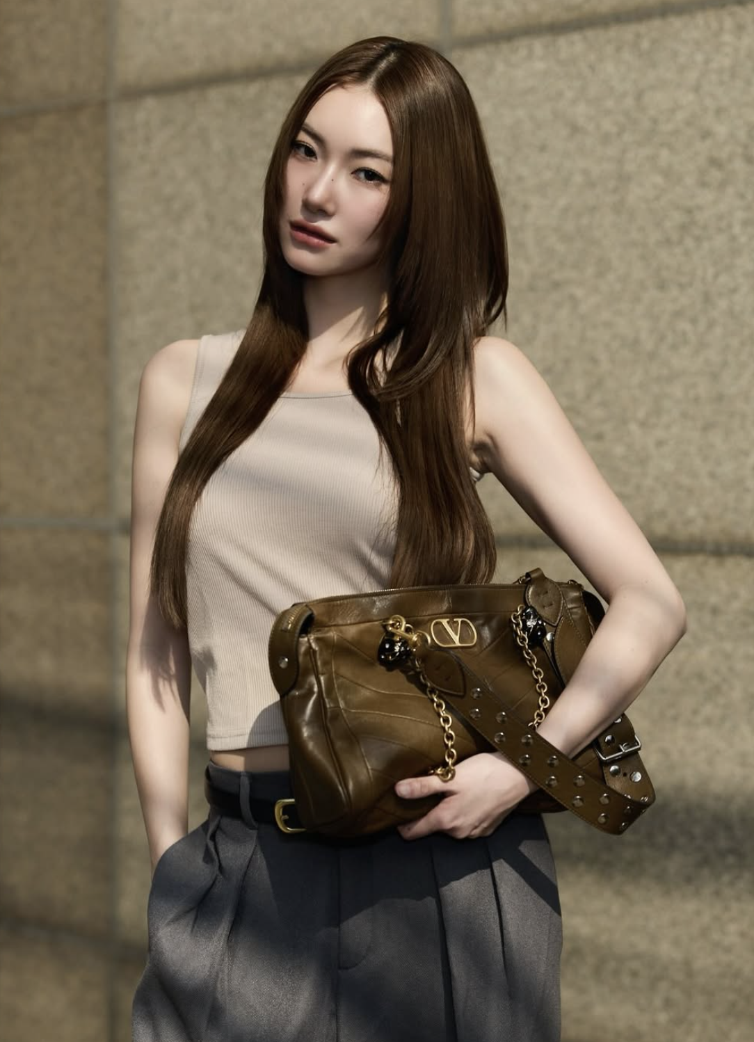 Phom áo ôm sát vừa vặn kết hợp thiết kế không tay, cổ tròn và dây mảnh khéo léo làm nổi bật bờ vai, xương quai xanh cùng đường nét cơ thể, tạo nên vẻ ngoài gọn gàng nhưng vẫn giữ được nét nữ tính cho nàng. Việc lựa chọn áo trơn, không họa tiết thể hiện rõ tinh thần tối giản và tính ứng dụng cao, để chất liệu co giãn, thoải mái phát huy đúng vai trò của một món đồ cơ bản. Khi phối cùng quần ống rộng tông nâu đậm và phụ kiện màu sắc nổi bật, áo tank top trở thành điểm cân bằng phom dáng, tạo nên sự đối lập hài hòa giữa dáng ôm và dáng rộng, từ đó hoàn thiện phong cách trẻ trung, năng động nhưng vẫn rất thời thượng cho nàng.