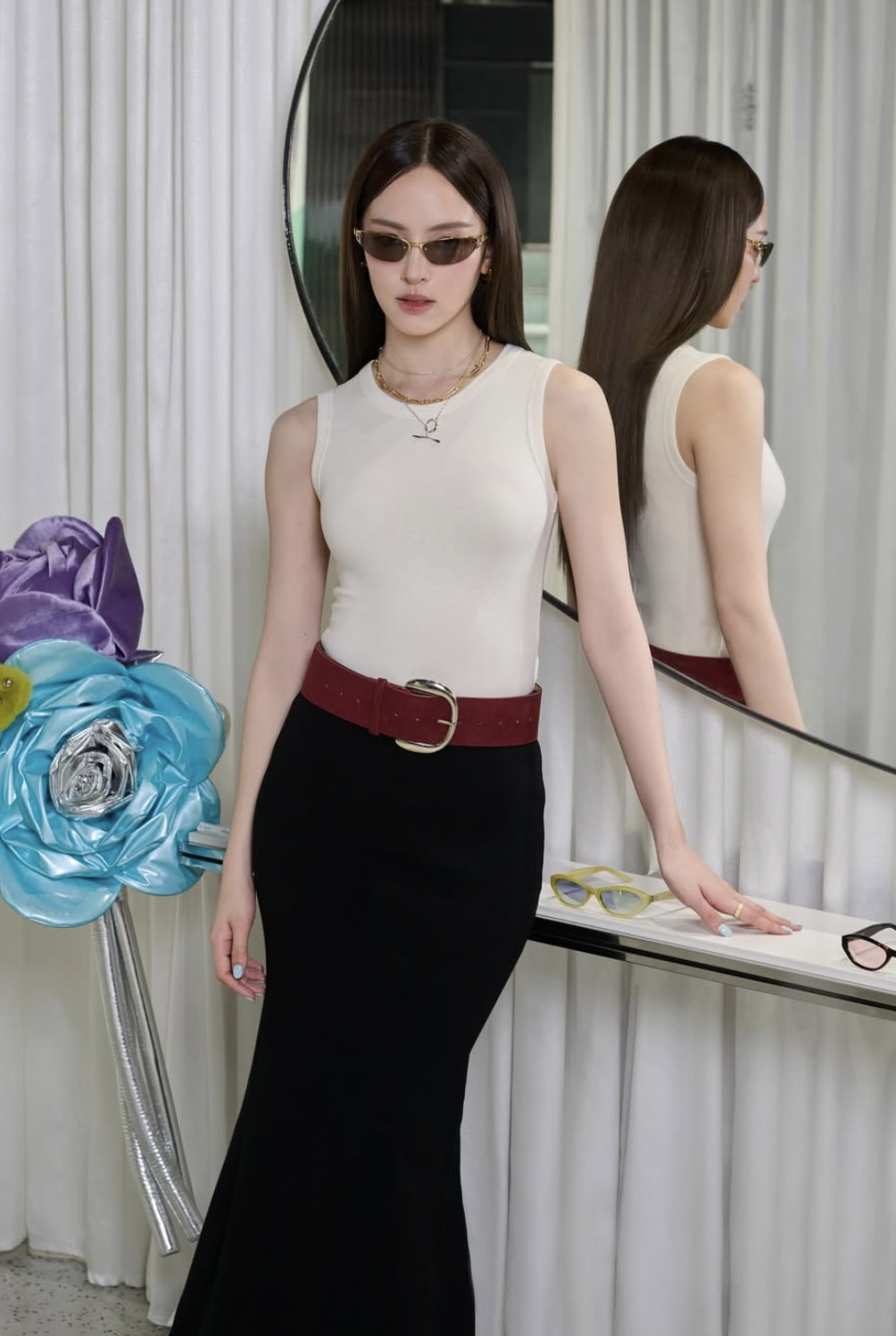 Nhờ sự tối giản về màu sắc và chi tiết, áo tank top trở thành món đồ nền lý tưởng khi kết hợp cùng chân váy dài tối màu và thắt lưng bản to, vừa cân bằng phom dáng vừa tạo điểm nhấn cá tính. Bản phối này khẳng định áo tank top không chỉ là món đồ cơ bản mà còn là lựa chọn linh hoạt, thời thượng, giúp nàng thể hiện gu thẩm mỹ hiện đại.