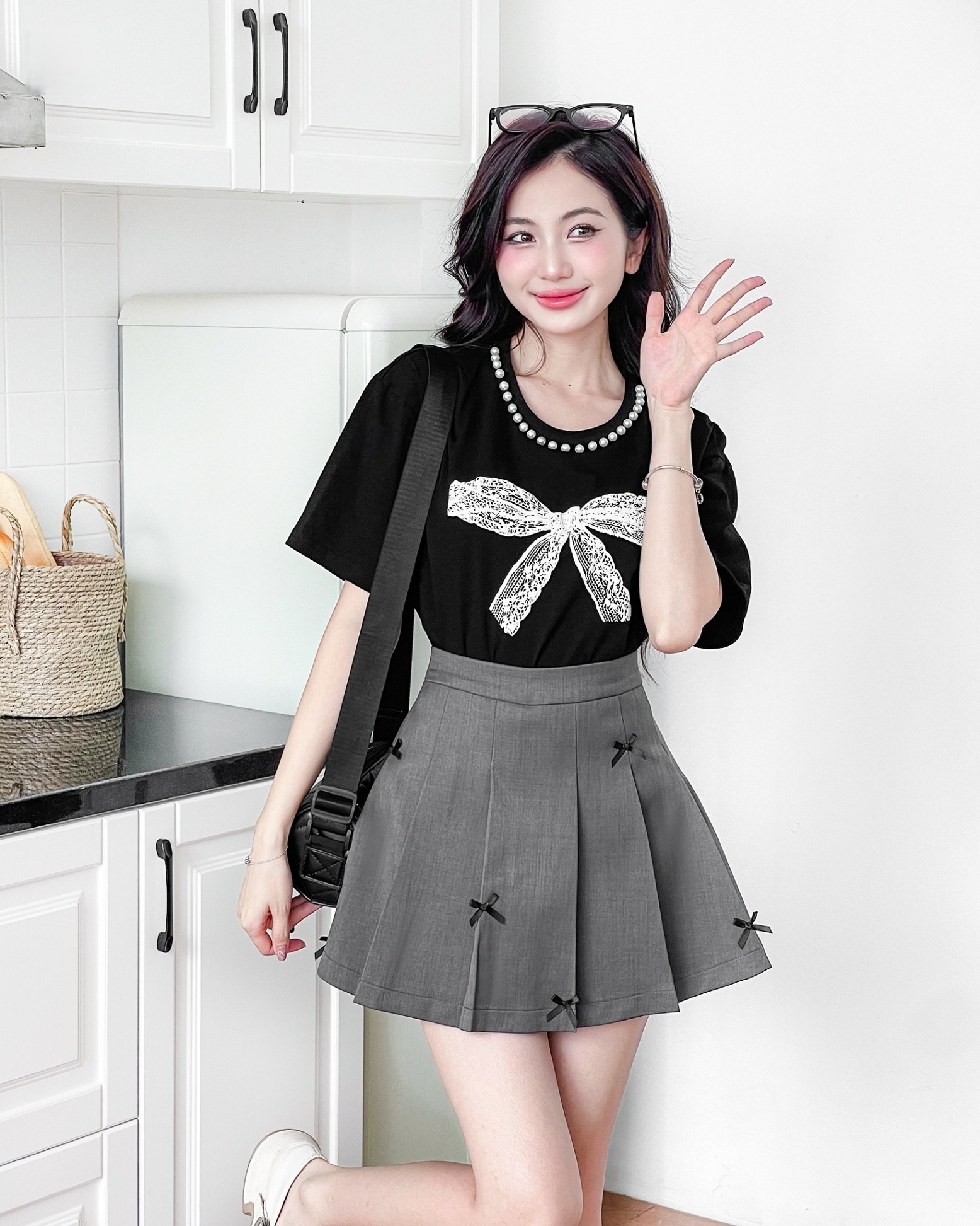 Áo thun phom rộng được điểm xuyết ngọc trai nơi cổ áo, kết hợp nơ ren trắng đính trước ngực, sơ vin gọn gàng cùng chân váy ngắn xếp ly sắc xám ghi dễ dàng tôn lên đôi chân thanh mảnh. Những chi tiết nơ nhỏ xinh đính dọc chân váy như những điểm nhấn tinh tế, vừa dịu dàng vừa mang đậm tinh thần thời trang.