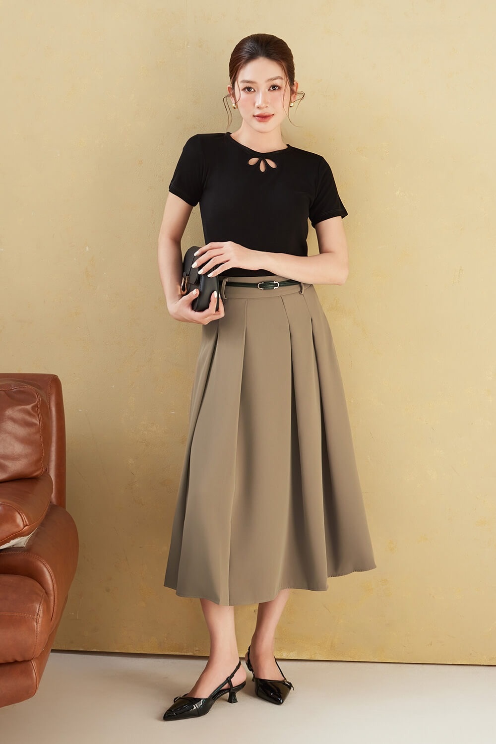 Ghi dấu phong cách chuyên nghiệp nơi công sở với áo thun trơn cổ tròn sắc pastel nhẹ nhàng, được sơ vin gọn gàng cùng chân váy trắng dáng dài xếp ly có chủ đích. Thắt lưng da đen dáng mảnh trở thành điểm kết nối tinh tế, tôn lên vòng eo thon gọn của người mặc. Hoàn thiện bằng giày cao gót mũi nhọn sắc trắng, khắc họa trọn vẹn thần thái sang trọng của người phụ nữ hiện đại. ẢNH: @IVY_MODA