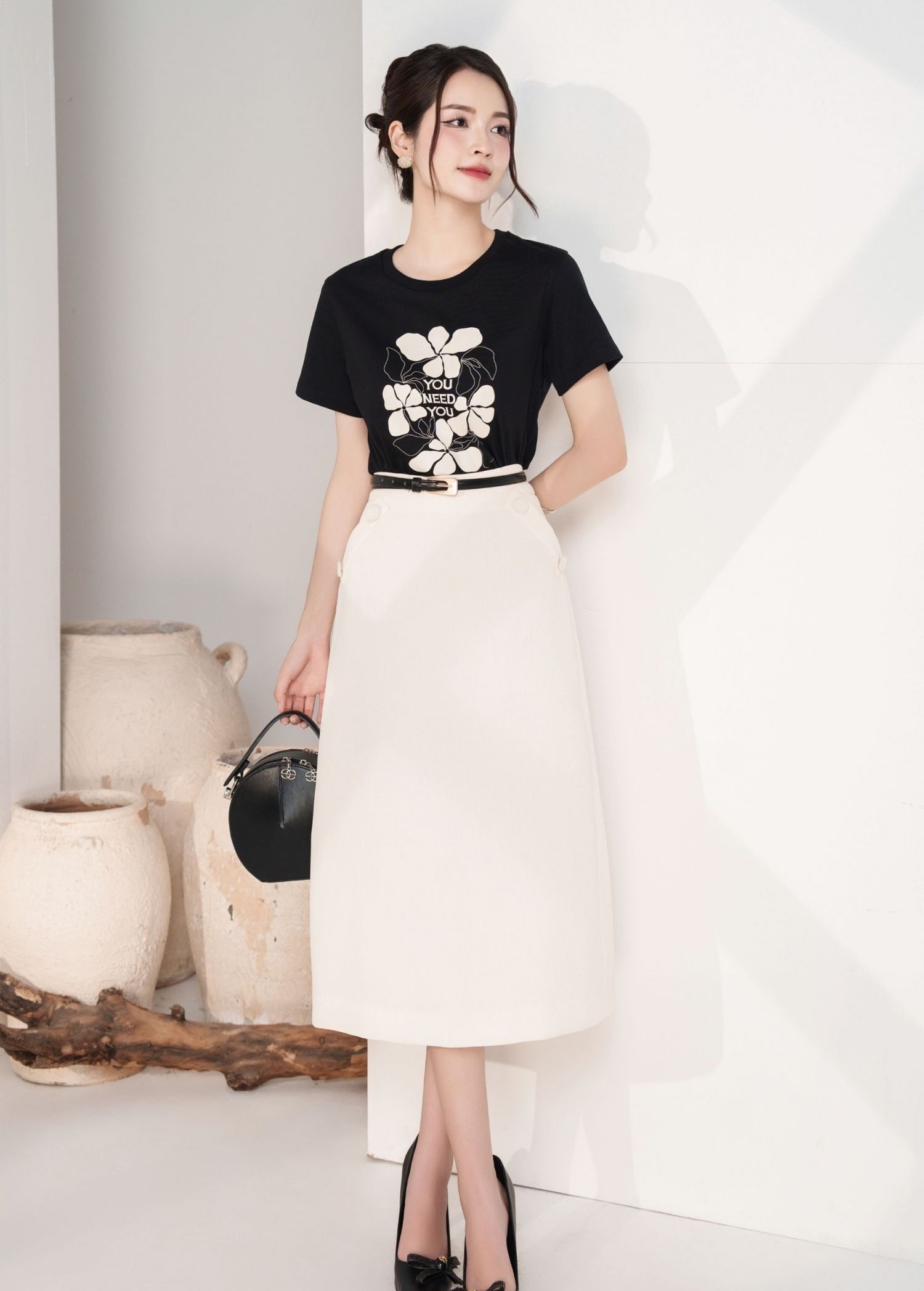 Áo thun và chân váy trắng luôn là lựa chọn được ưu ái trong tiết trời đầu xuân. Áo thun đen cổ tròn với họa tiết hoa sắc âm bản mang đến vẻ đẹp ngọt ngào. Khi kết hợp cùng chân váy trắng trơn dáng dài với phom xòe nhẹ tăng thêm phần trẻ trung. Bản phối với sắc đen trắng dễ dàng trở thành điểm nhấn, thu hút mọi ánh nhìn. ẢNH: @ELISE_FASHION