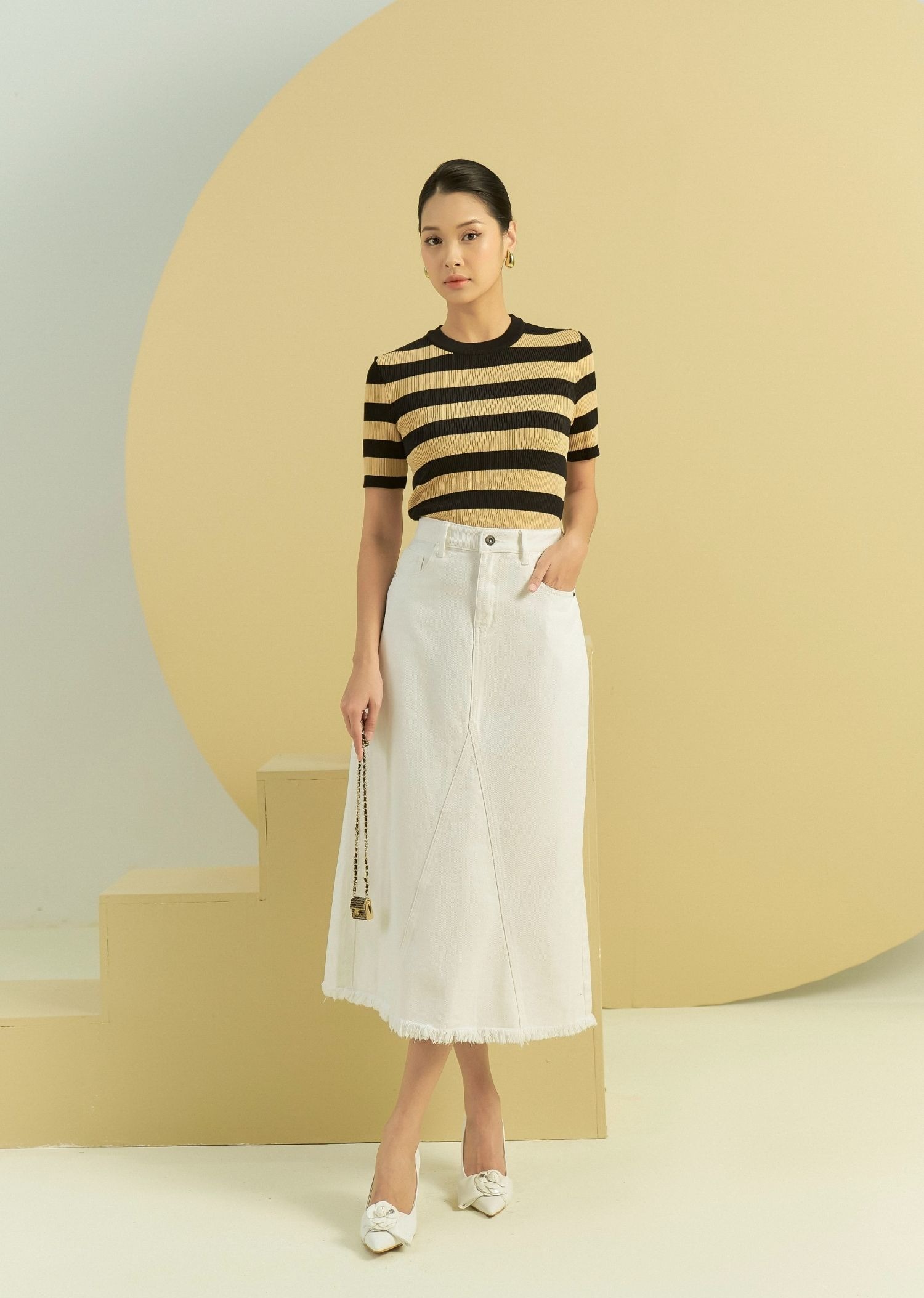 Cá tính hơn với áo thun họa tiết kẻ sọc đen pha sắc vàng nổi bật, đi cùng chân váy kaki dáng dài sắc trắng với phần tà được thiết kế tua rua độc đáo. Sự giao thoa giữa chất liệu thun tăm ôm dáng và kaki cứng cáp tạo nên tổng thể hài hòa, phô diễn nét đẹp riêng biệt. ẢNH: @ELISE_FASHION