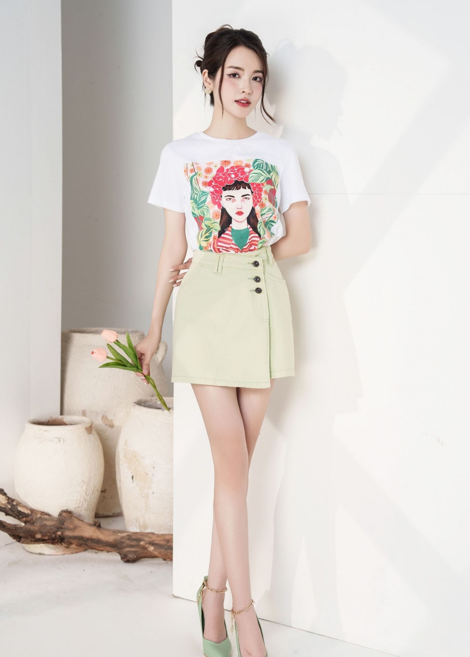 Bản phối áo thun trắng với họa tiết sinh động trên nền áo giúp trang phục bớt đơn điệu. Sơ vin khéo léo cùng chân váy kaki màu pastel với thiết kế lệch tà cùng phom chữ A giúp tôn lên đôi chân dài thon gọn. Kết hợp cùng giày cao gót mũi nhọn là nàng đã tự tin sải bước giữa phố ngày hè. ẢNH: @ELISE_FASHION