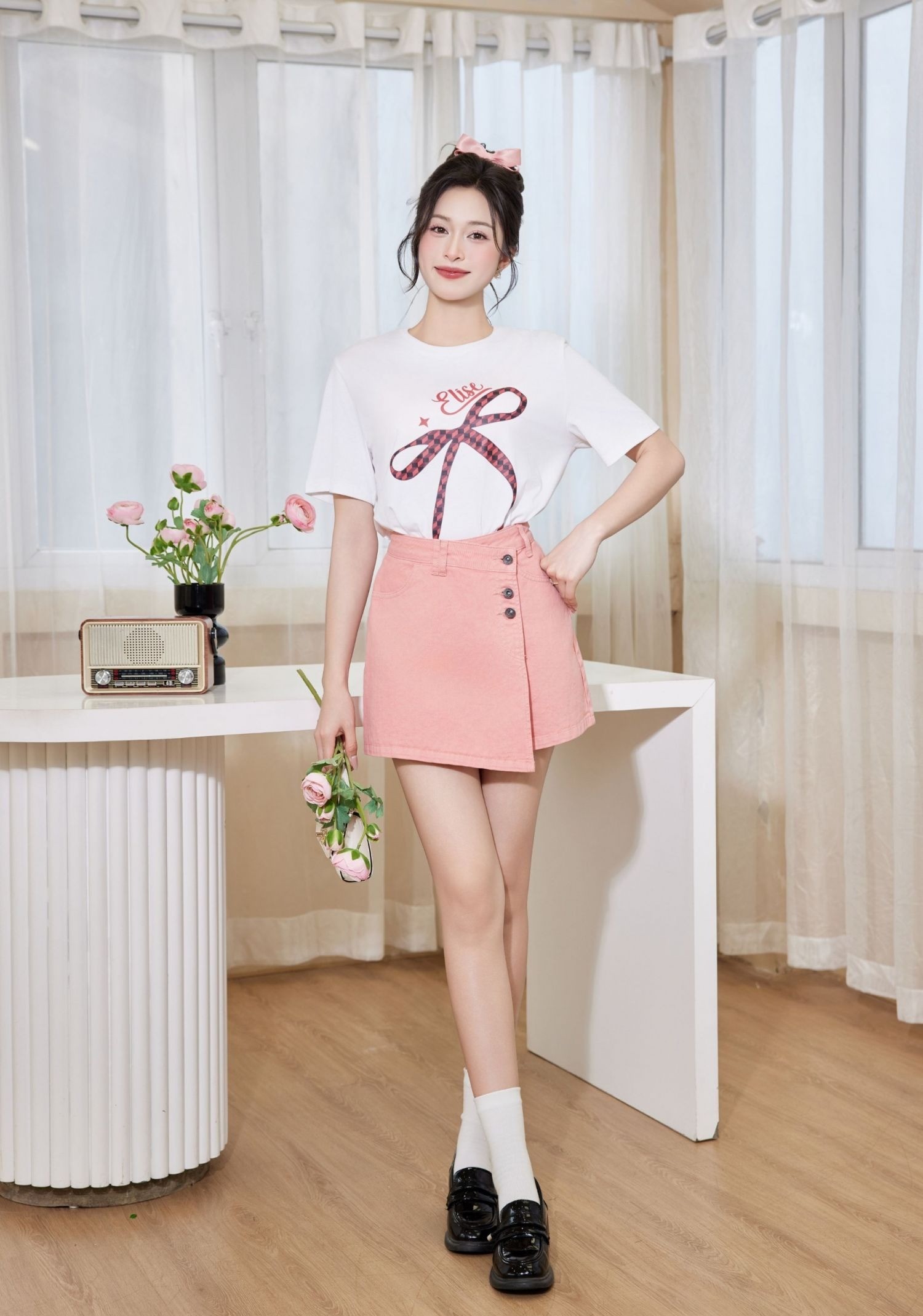 Áo thun trắng cổ tròn bo chun với họa tiết hình nơ bản lớn, phối cùng chân váy kaki sắc hồng phấn phom dáng chữ A cùng hàng khuy được đính kết thẳng hàng làm tôn lên sự chỉn chu cho người mặc. ẢNH: @ELISE_FASHION