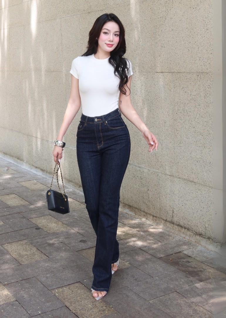 Chiếc áo thun trắng ôm body với họa tiết trơn nhã nhặn. Sơ vin khéo léo cùng quần jeans cạp cao ôm body khoe trọn đường cong gợi cảm của phái đẹp. Sắc trắng của áo hòa cùng tông xanh của quần khiến nàng toát lên sự tươi trẻ. ẢNH: @AAA_JEANS