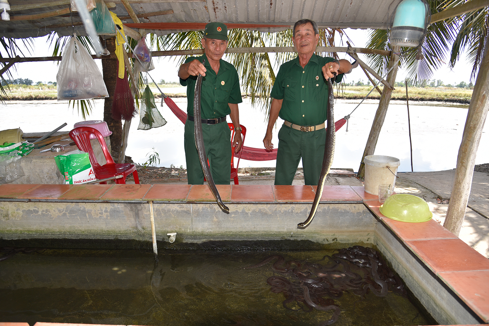 Ông Cao Văn Khanh (bên phải) bên trại rắn của gia đình. Ảnh: ĐẶNG LINH