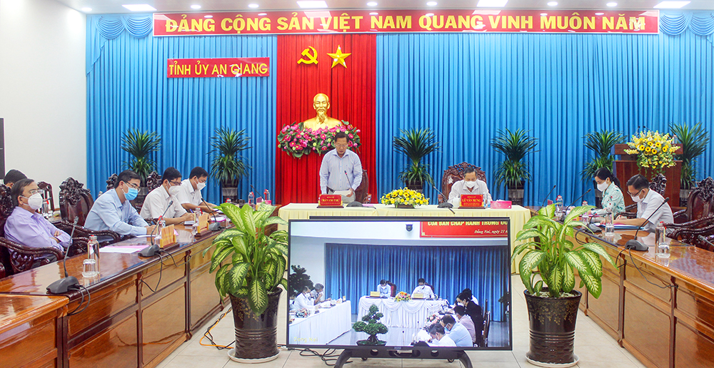 Phó Bí thư Thường trực Tỉnh ủy, Chủ tịch HĐND tỉnh An Giang Lê Văn Nưng; Phó Chủ tịch UBND tỉnh An Giang Trần Anh Thư tham dự hội nghị tại điểm cầu Văn phòng Tỉnh ủy An Giang.