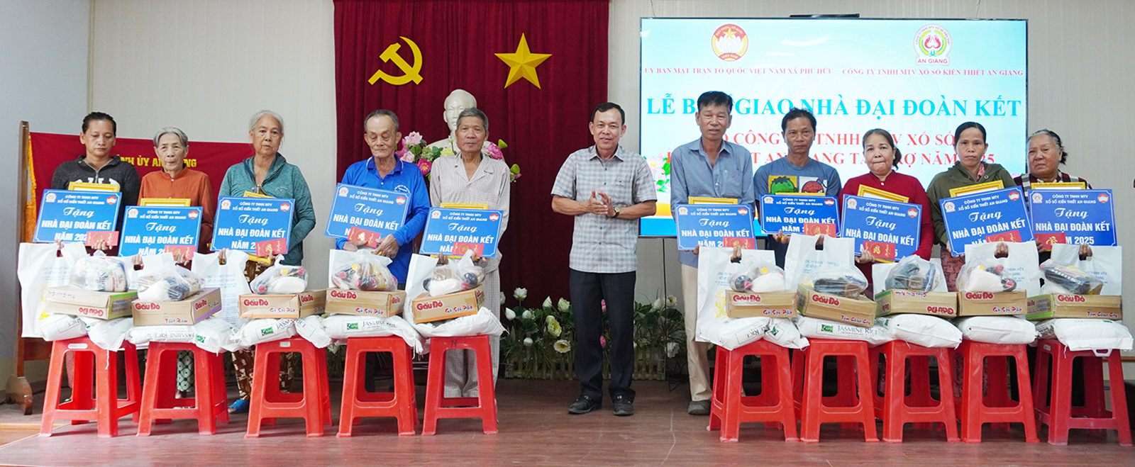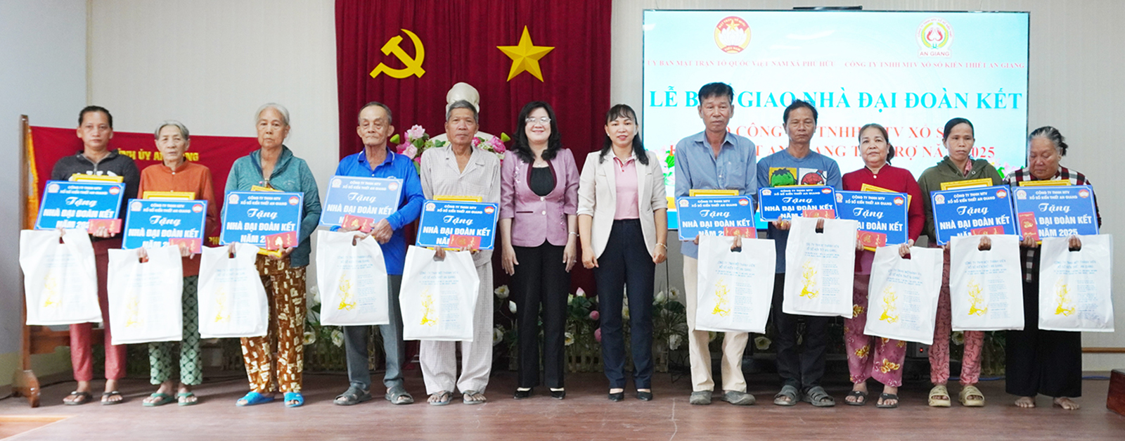 Phó Chủ tịch Ủy ban MTTQ tỉnh An Giang Hà Minh Trang; Chủ tịch Công ty TNHH MTV Xổ số kiến thiết An Giang Phan Thị Kim Hai trao bảng tượng trưng nhà Đại đoàn kết cho các hộ khó khăn.