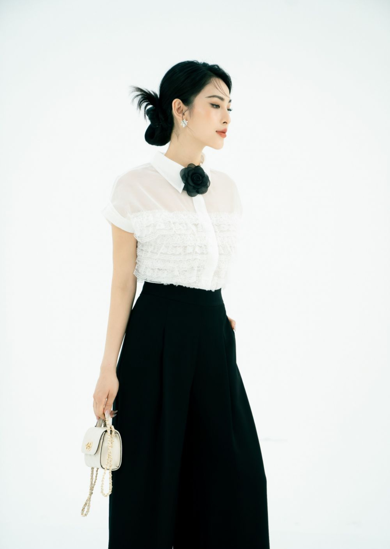Xuất hiện với chiếc sơ mi trắng tay ngắn làm từ voan mỏng nhẹ, phần vai và ngực điểm bèo nhún uyển chuyển. Điều tạo nên sức hút mạnh mẽ nhất chính là đóa hoa cài màu đen bản lớn ở cổ áo, nổi bật trên nền trắng tinh khôi, mang đến vẻ đẹp vừa cổ điển vừa kiêu kỳ. Đi kèm là chiếc chân váy đen tạo độ bồng bềnh, giúp chuyển động cơ thể trông nhẹ nhàng và sang trọng hơn.
