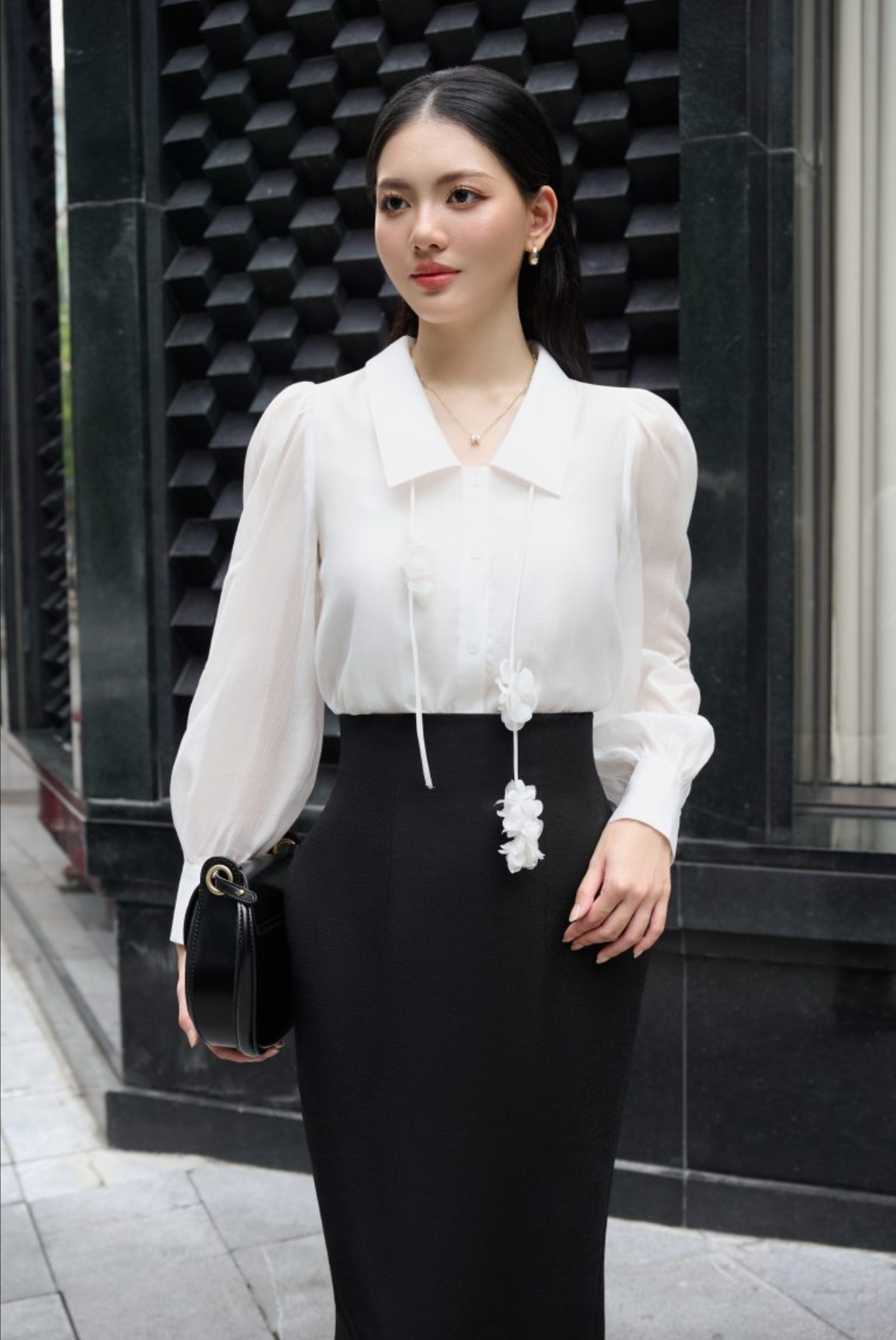Một lựa chọn khác đầy thanh lịch là sơ mi trắng chất liệu voan với cổ bẻ ngang và tay dài bồng nhẹ. ẢNH: WHITECHIC