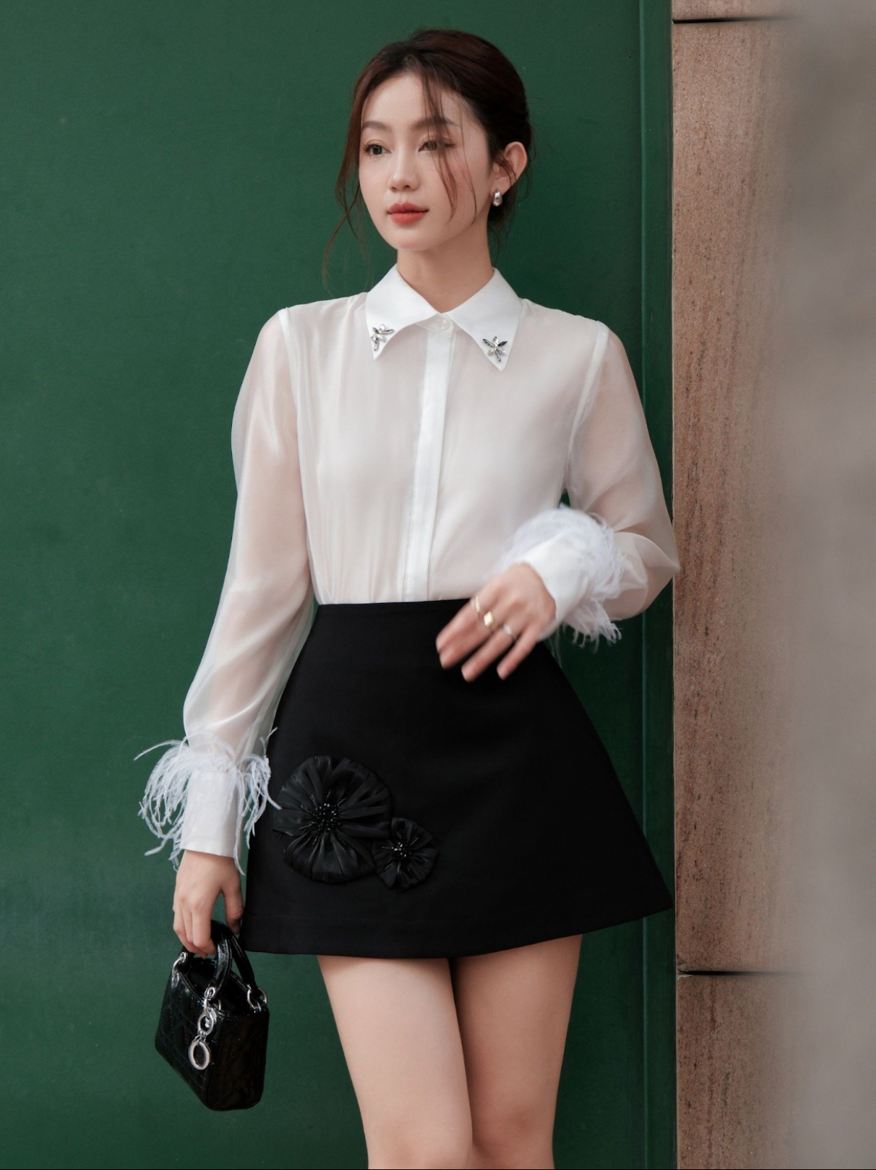 Một phiên bản tiểu thư sang trọng hơn đến từ chiếc sơ mi trắng có chi tiết lông vũ mềm mại ở cổ tay và hạt đính sáng nơi cổ áo. ẢNH: JOVEN FASHION