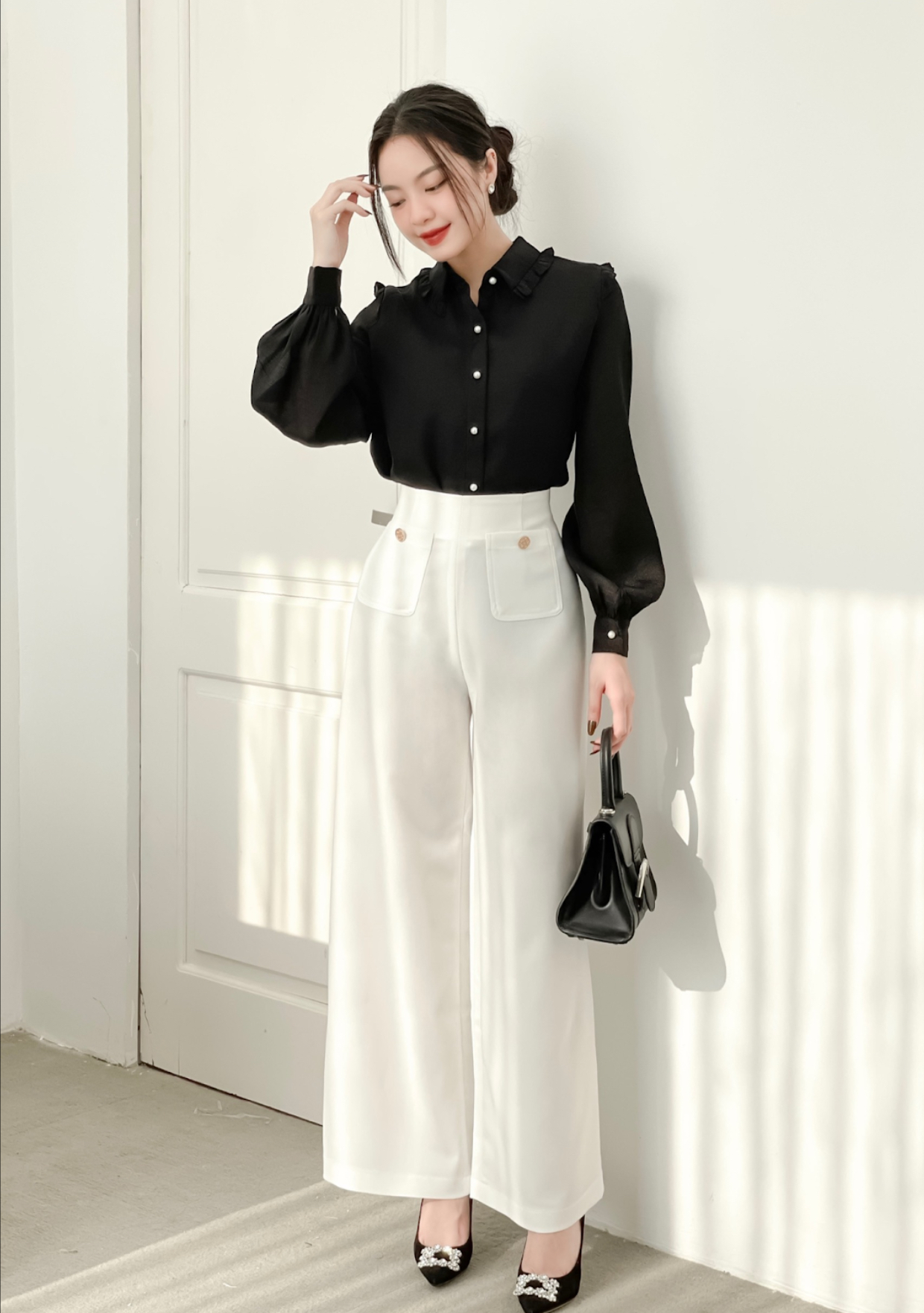 Khi đảo ngược công thức truyền thống, chọn áo đen phối cùng quần hoặc chân váy trắng nàng sẽ có ngay một diện mạo đẳng cấp. Áo sơ mi đen dài tay với phần vai bồng nhẹ tạo độ sắc nét cho khung vai, hàng cúc trắng nổi bật tạo điểm nhấn thanh lịch. Khi được sơ vin cùng chiếc quần ống rộng trắng cạp cao với chi tiết túi viền nổi bật, tỷ lệ cơ thể được kéo dài tinh tế.