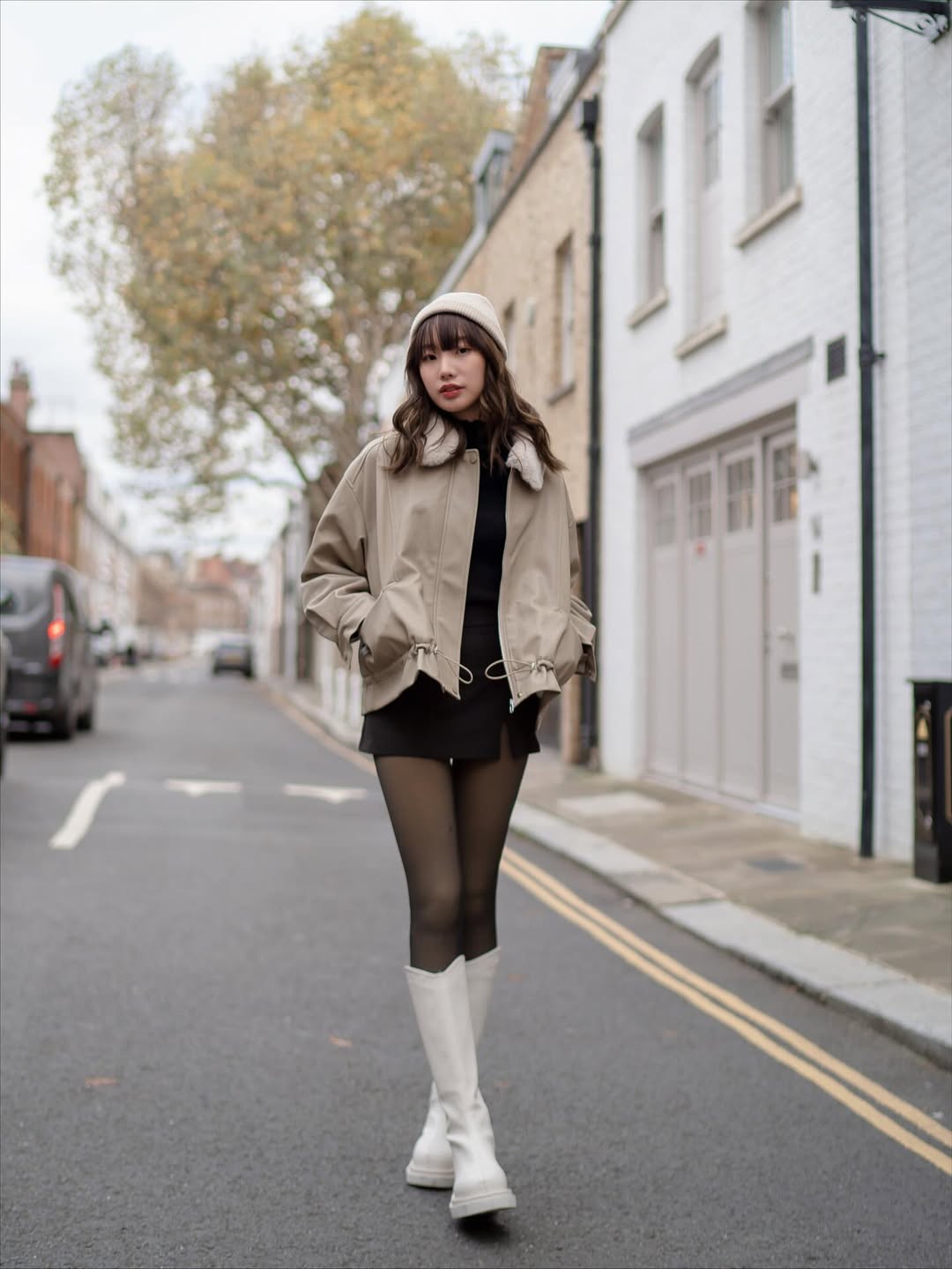 Khi muốn thể hiện “chất riêng” rõ nét hơn, bốt cao cổ chính là lựa chọn lý tưởng. Chỉ cần một đôi bốt da trơn phối cùng váy ngắn và áo khoác bomber, hình ảnh người phụ nữ hiện lên đầy mạnh mẽ nhưng vẫn không kém phần quyến rũ. Áo bomber khoác ngoài mang hơi thở đường phố, trong khi váy ngắn giúp tổng thể không bị thô cứng. Thêm phụ kiện như mũ len hoặc túi đeo vai nhỏ xinh, bản phối này đủ sức giúp bạn nổi bật trong mọi khung hình.