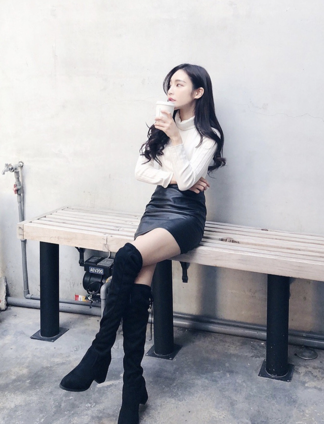 Tối giản nhưng đầy cuốn hút khi diện trang phục tông đen trắng đối lập. Đôi giày bốt quá gối là điểm nhấn, thiết kế bốt dáng ôm sát, chất liệu da lộn mềm mại giúp tôn trọn đôi chân thon dài, đồng thời tạo cảm giác sang trọng và có chiều sâu thị giác. Phần gót nhọn vừa phải mang lại vẻ nữ tính nhưng không kém phần sắc sảo, rất hài hòa với chân váy da ngắn ôm gọn và áo cổ cao màu trắng thanh lịch.