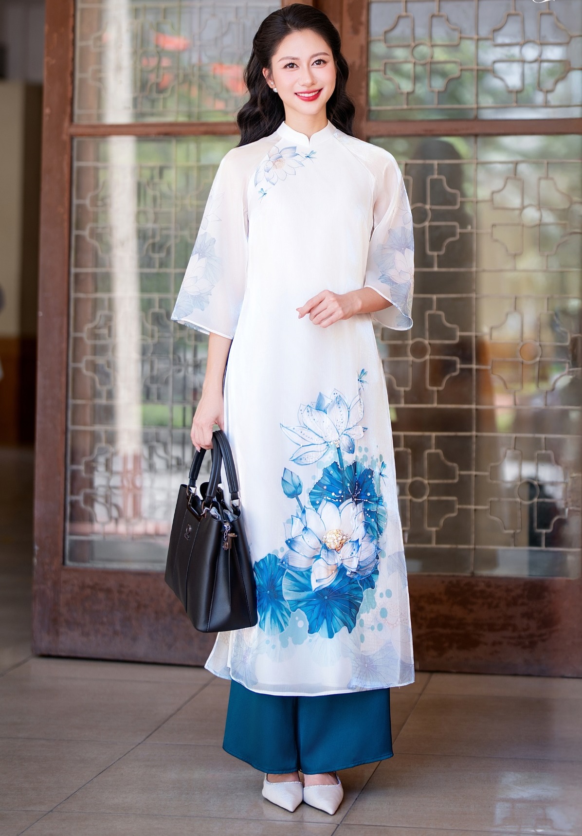 Điểm nhấn của thiết kế này chính là họa tiết hoa sen nở rộ nơi tà áo. Sắc lam an yên, gợi nét đẹp của người phụ nữ dịu dàng mà sâu sắc. Tà áo ấy kết hợp với quần lụa xanh dương lại càng trở nên hài hòa. ẢNH: ECONICE