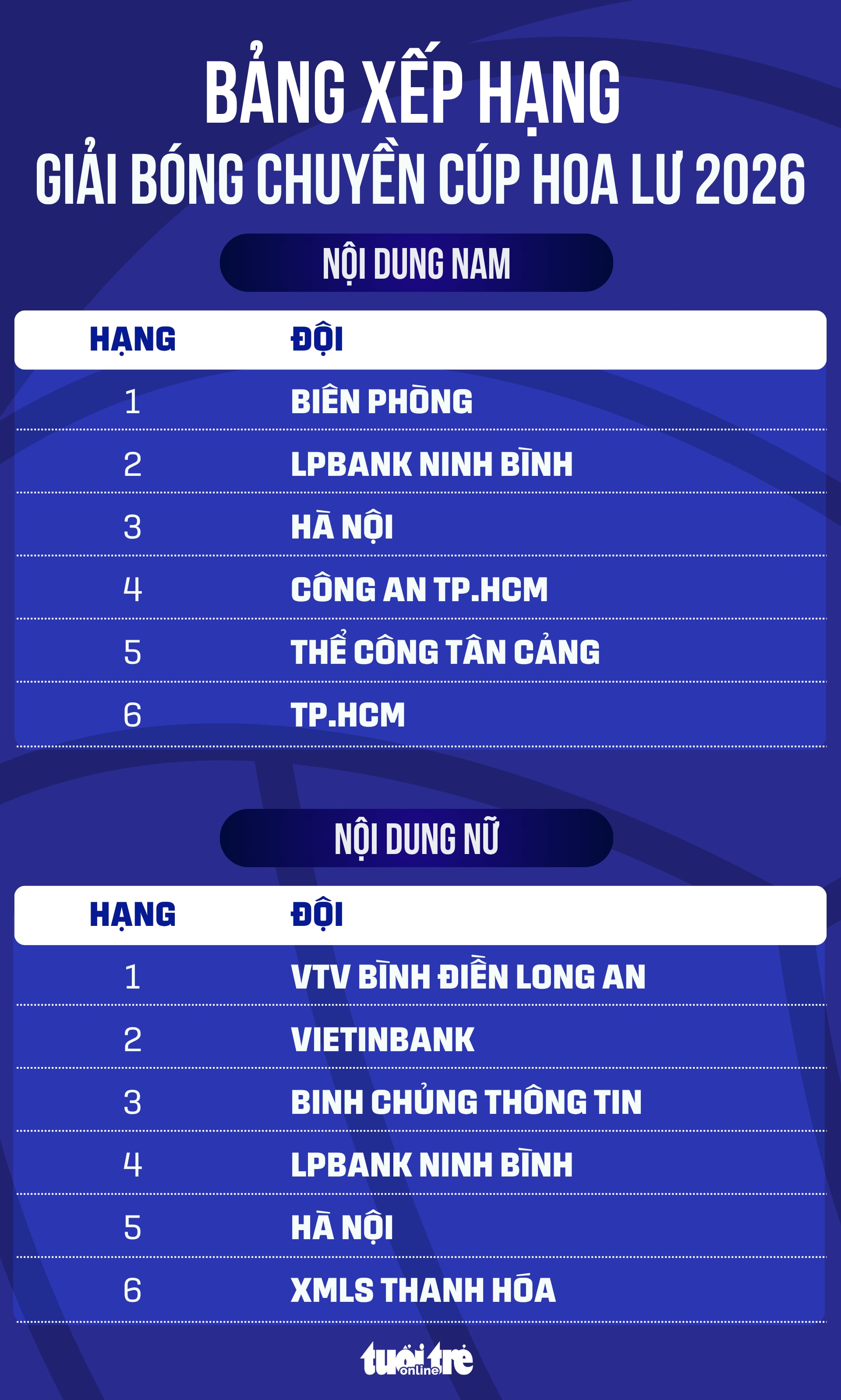 Bảng xếp hạng Cúp Hoa Lư 2026 - Đồ họa: AN BÌNH