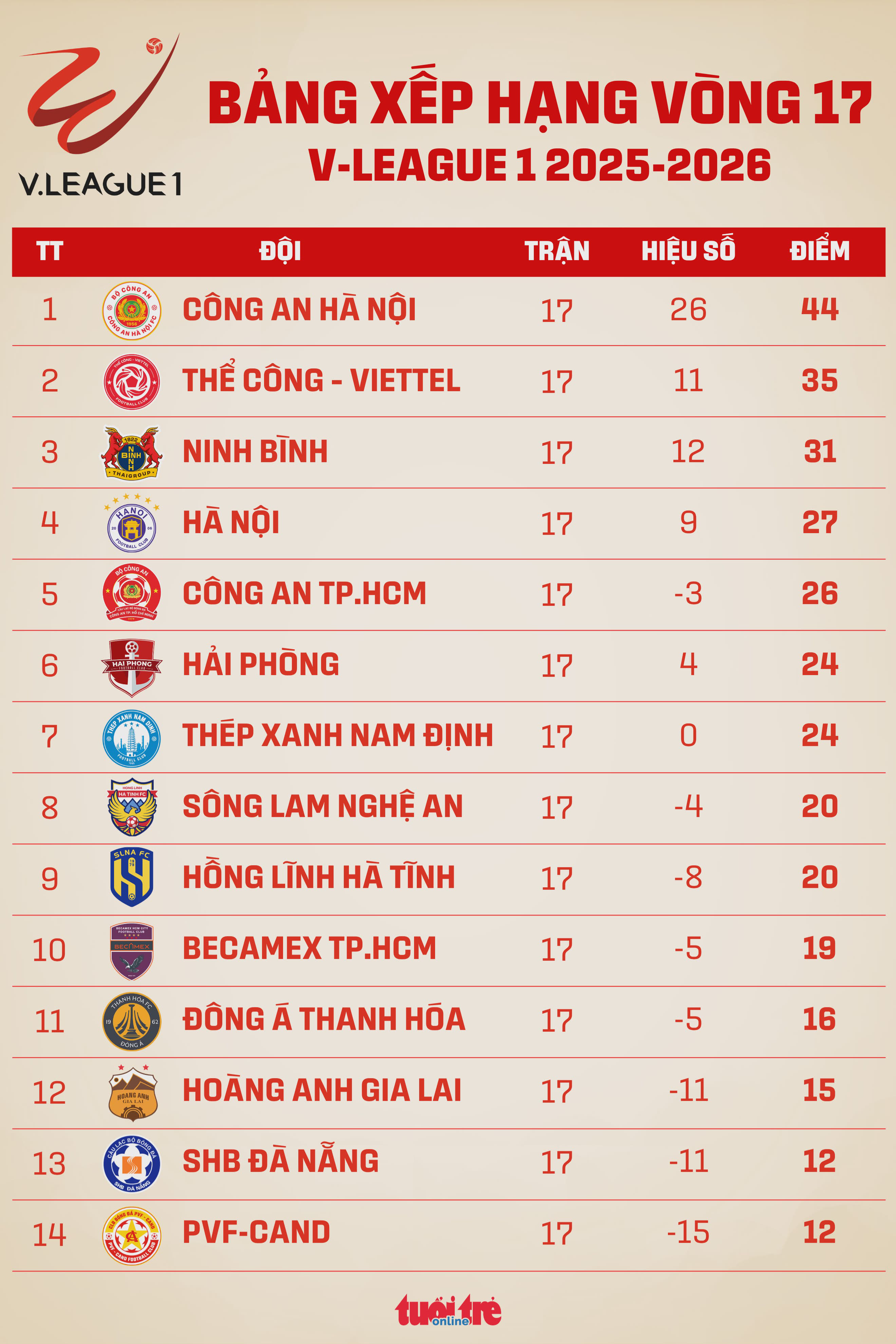 Bảng xếp hạng V-League vòng 17: Công An Hà Nội tạo cách biệt 9 điểm - Đồ họa: AN BÌNH