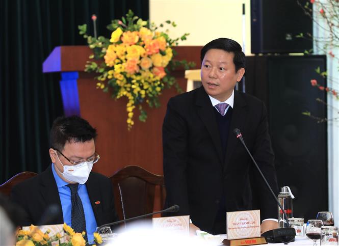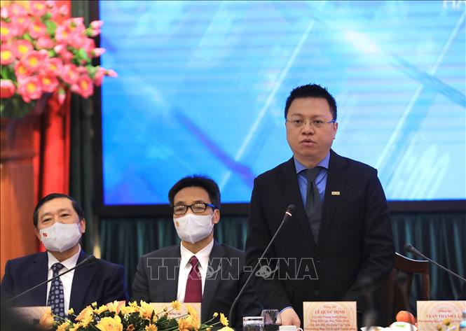 Ủy viên Trung ương Đảng, Phó Trưởng ban Tuyên giáo Trung ương, Bí thư Đảng đoàn, Chủ tịch Hội Nhà báo Việt Nam, Tổng Biên tập Báo Nhân Dân Lê Quốc Minh phát biểu. Ảnh: Hoàng Hiếu/TTXVN