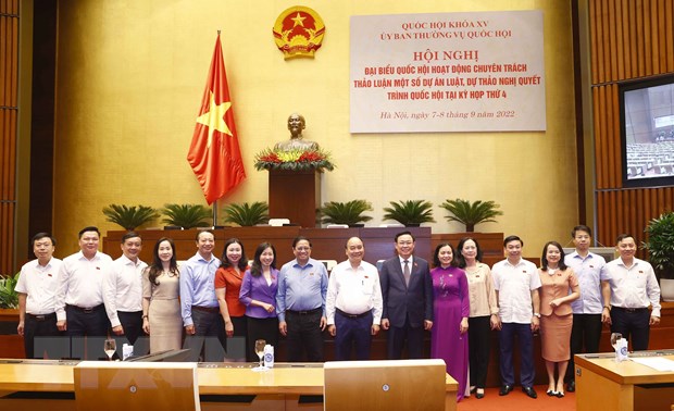 Quang cảnh hội nghị đại biểu Quốc hội hoạt động chuyên trách để thảo luận một số nội dung trình Quốc hội tại kỳ họp thứ tư, Quốc hội khóa XV. (Ảnh: Doãn Tấn/TTXVN)